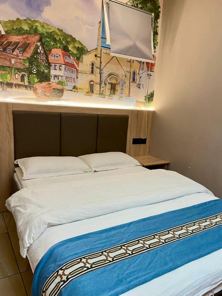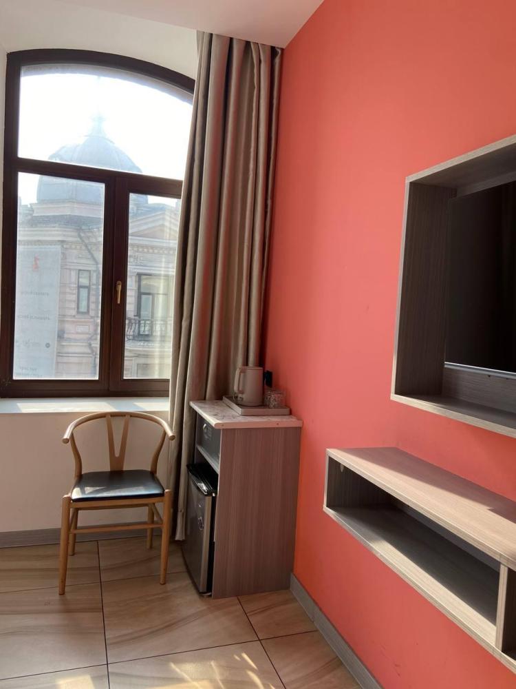 Уважаемые гости, В наличии есть несколько номеров с одной двуспальной кроватью и окном. Номера оборудованы спутниковым ТВ, холодильником, сейфом, рабочей зоной и собственным санузлом с душевыми принадлежностями. Вид из окна может быть на город, улицу или во двор, в зависимости от расположения номера. Дизайн каждого номера уникален. При необходимости мы готовы предоставить фото и видеообзоры забронированных вами номеров.
