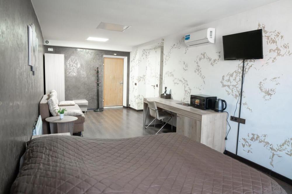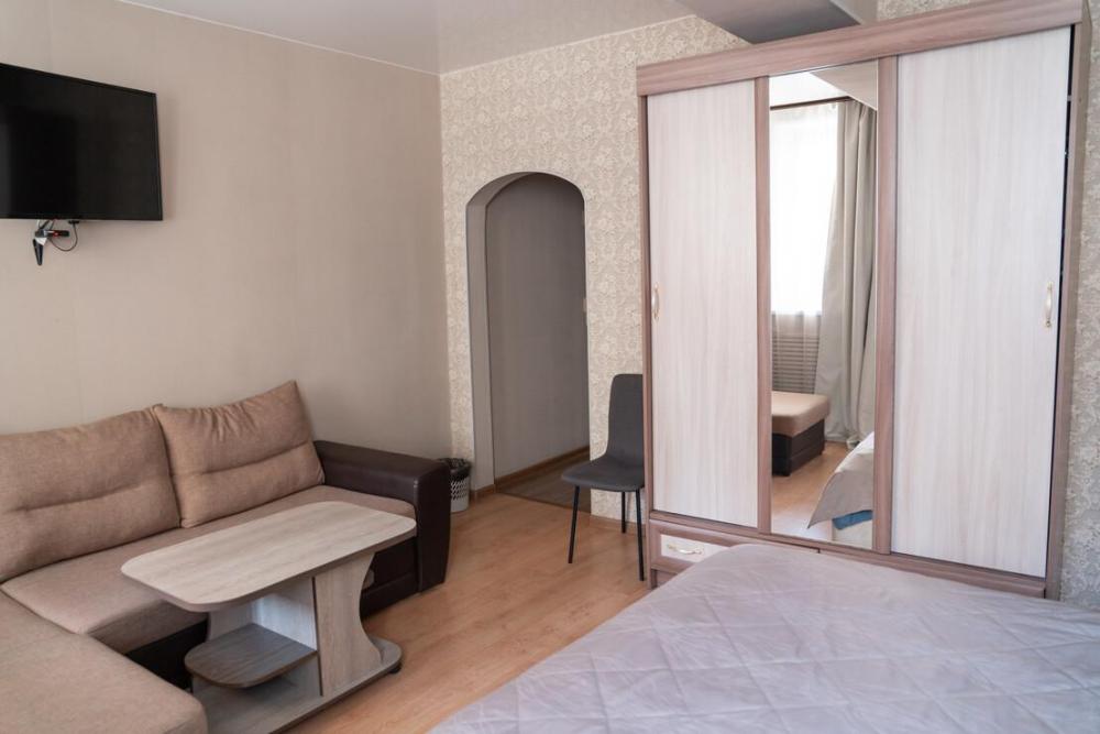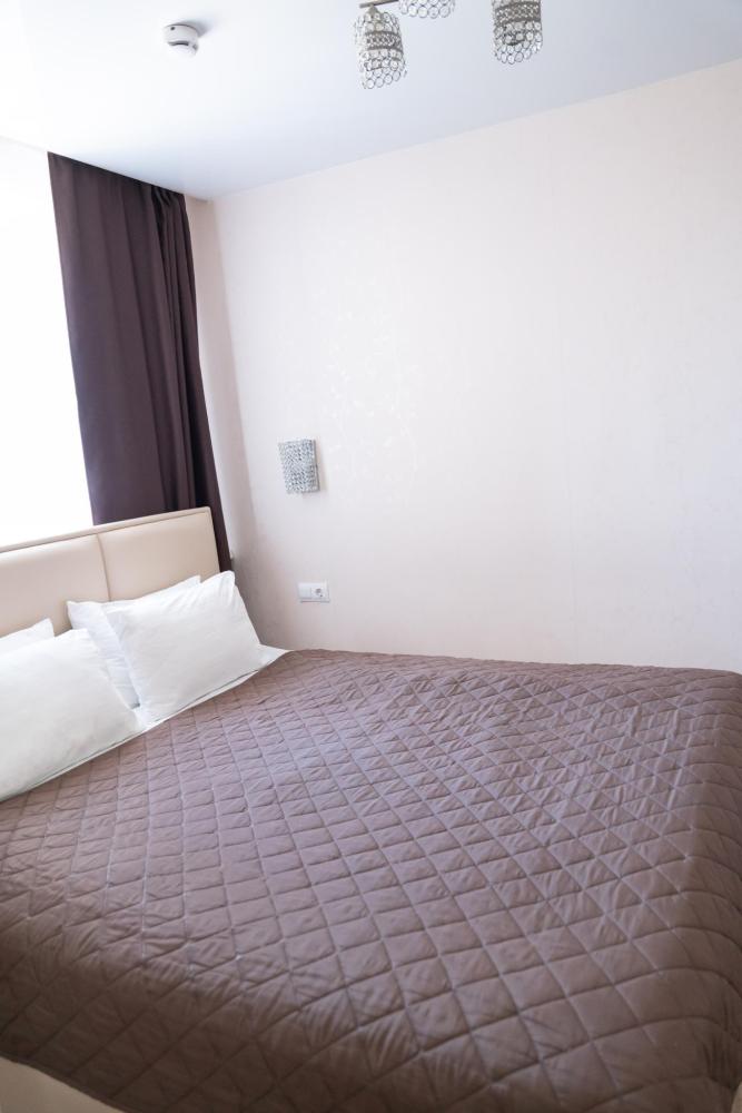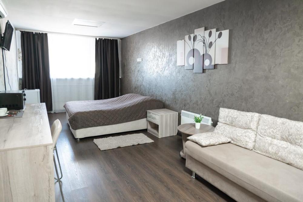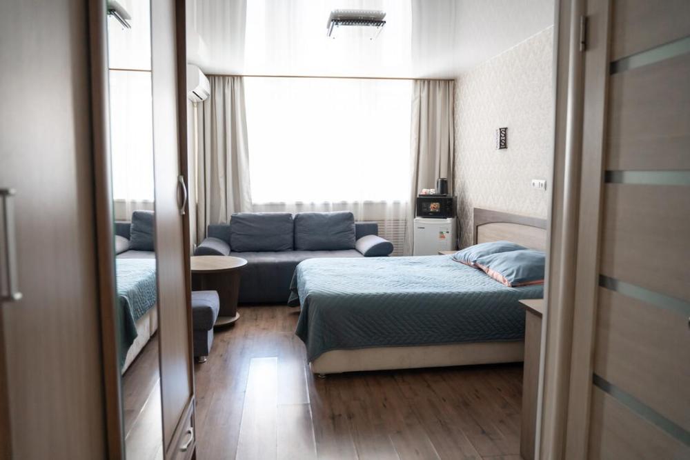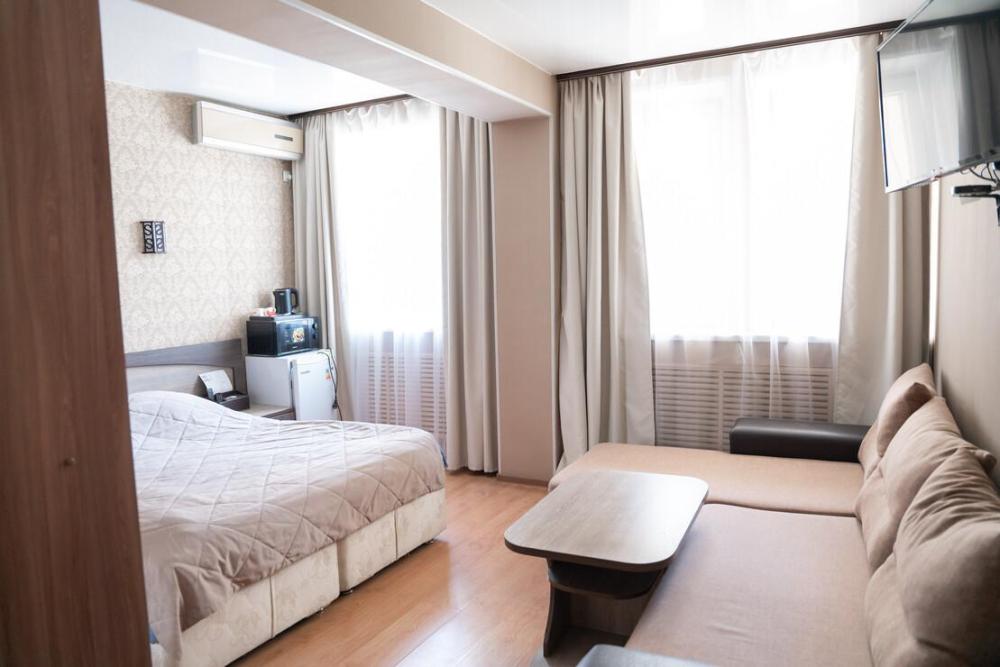 Двухкомнатный номер, оформленный в бежевых тонах. В номере: ЖК телевизор, двуспальная кровать, диван-кровать, журнальный столик, шкаф, ванная комната с одноразовыми средствами личной гигиены.