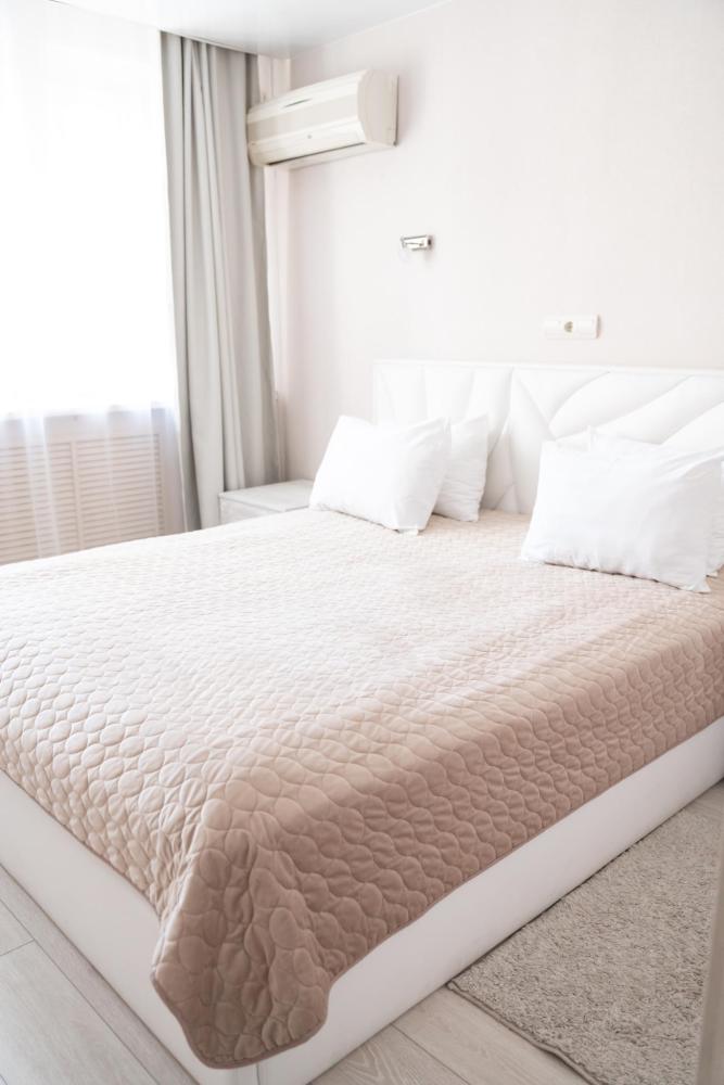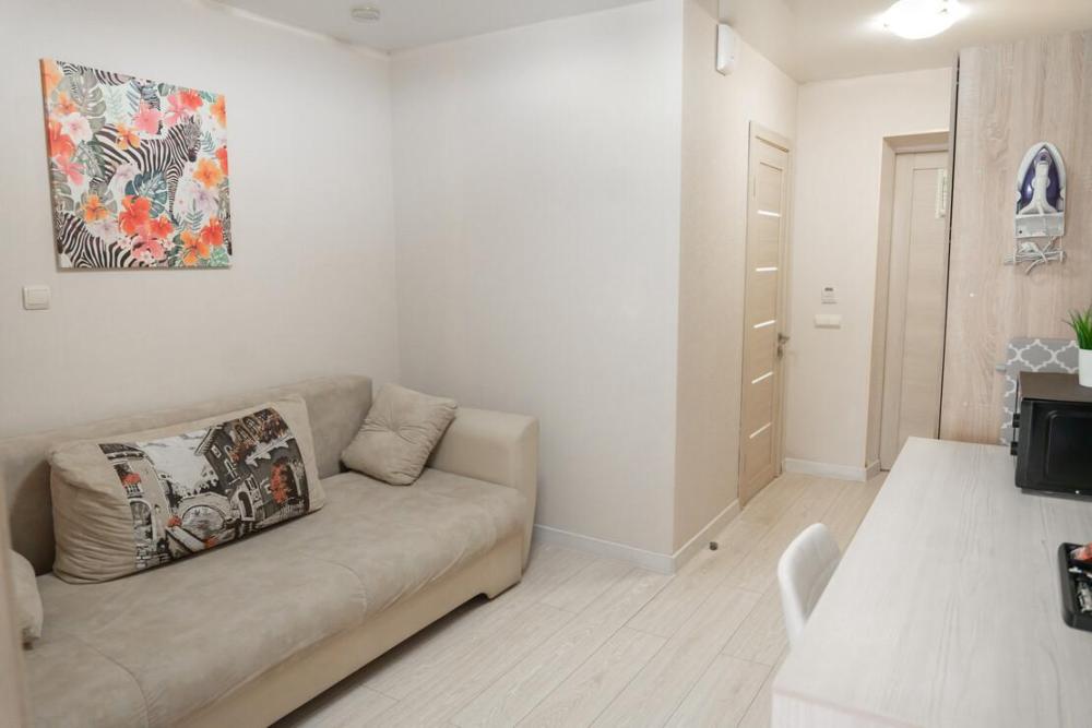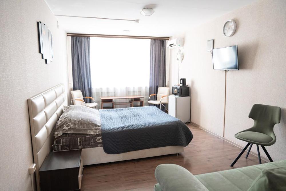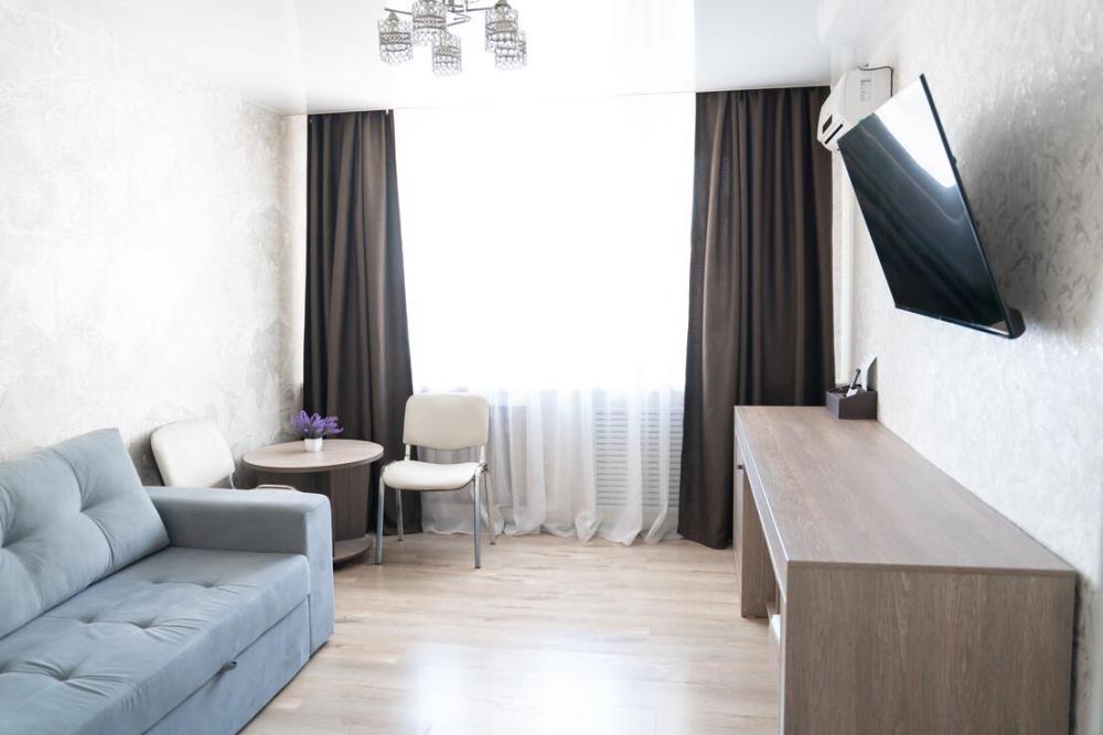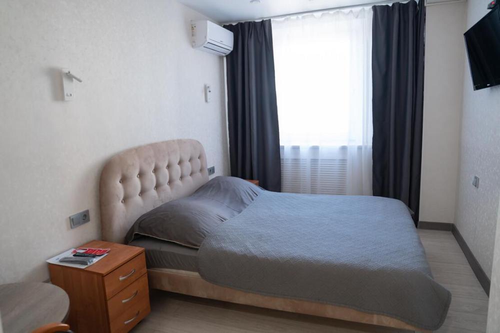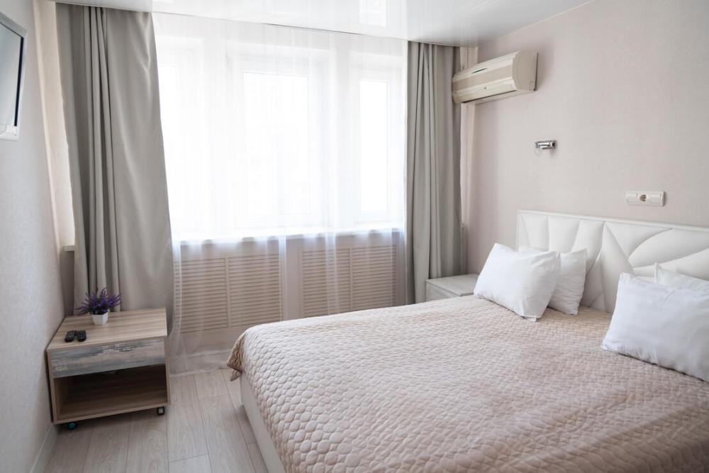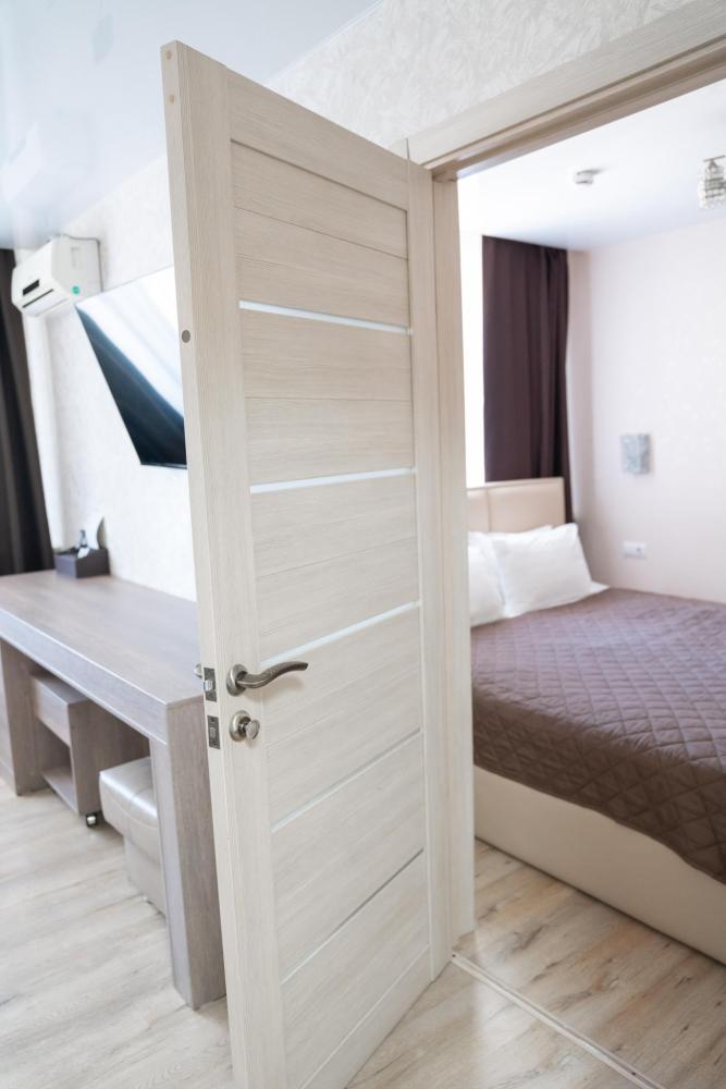 Двухкомнатный номер, оформленный в бежевых тонах. В номере: ЖК телевизор, двуспальная кровать, диван-кровать, журнальный столик, шкаф, ванная комната с одноразовыми средствами личной гигиены.