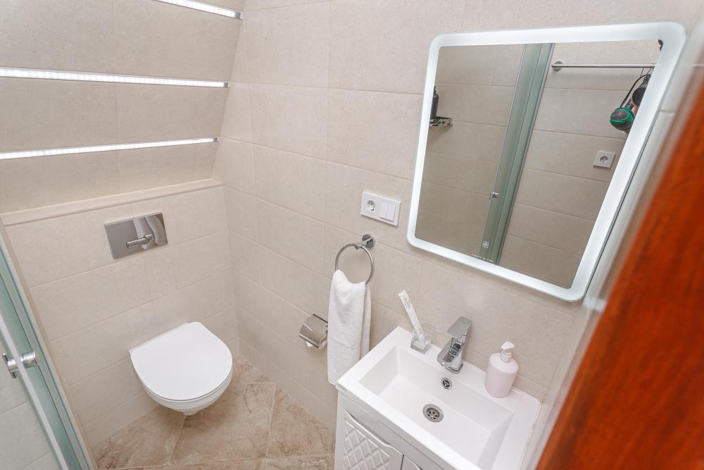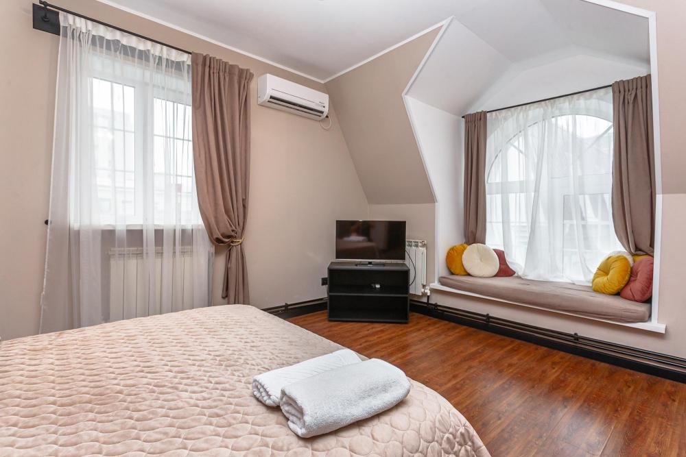 Двухуровневый просторный уютный номер. Первый этаж поделен на две зоны, первая выполняет роль кухни и гостиной, она включает: гостиный уголок, мини - кухню, ЖК телевизор, интернет (кабельный и Wi-Fi ,бесплатно), холодильник, микроволновую печь, эл. чайник, чайные приборы. Во второй зоне обустроена спальня с широкой двуспальной кроватью, телефоном, кондиционером и выходом на балкон. На втором этаже обустроена уютная спальня с двуспальной кроватью. В ванной комнате установлена современная душевая кабина, есть набор полотенец, фен, халат, тапочки и туалетные принадлежности.