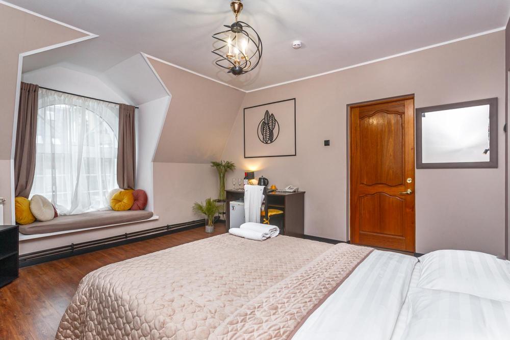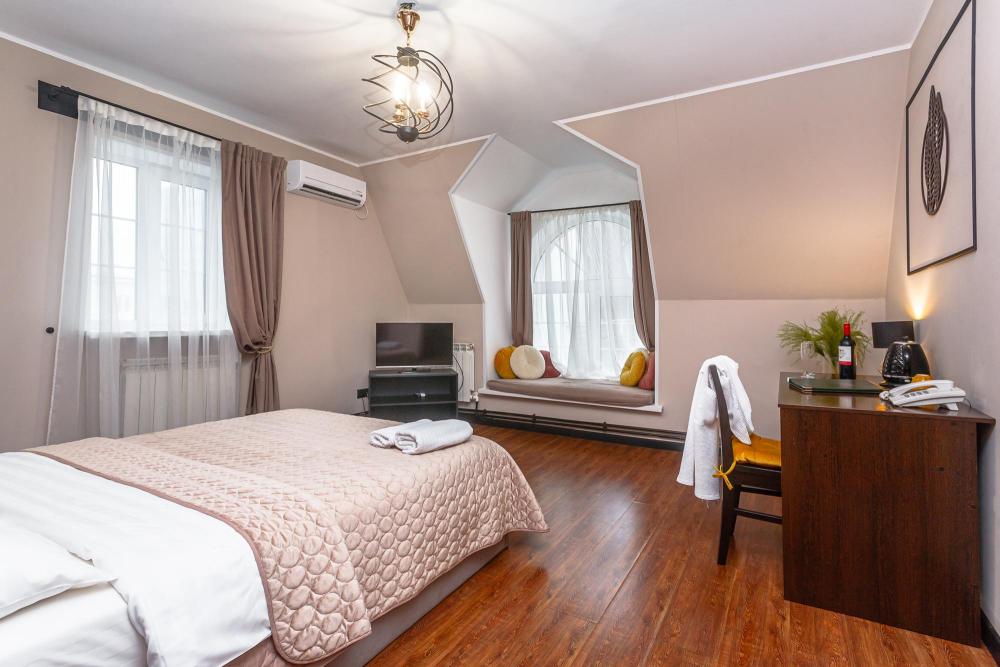 Просторный, комфортабельный номер для тех, кто ценит удобство во всем. В номере: широкая двуспальная кровать, письменный стол, кондиционер, ЖК телевизор, телефон, Wi-Fi бесплатно, холодильник, эл. чайник, чайные приборы. В гостиной зоне: журнальный столик, мягкие кресла и диван - кровать. В ванной установлена современная душевая кабина, есть набор полотенец, тапочки и туалетные принадлежности.