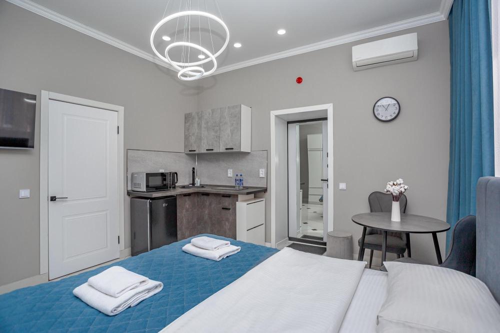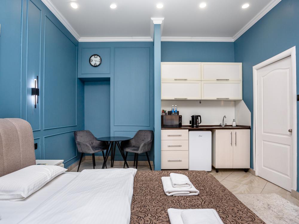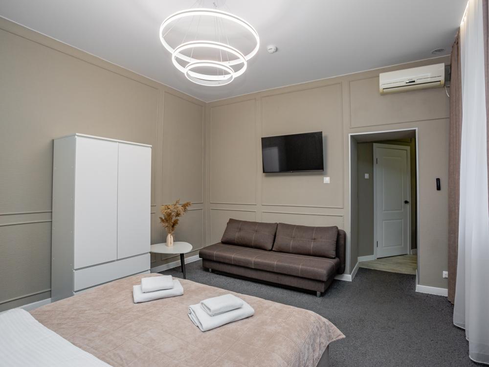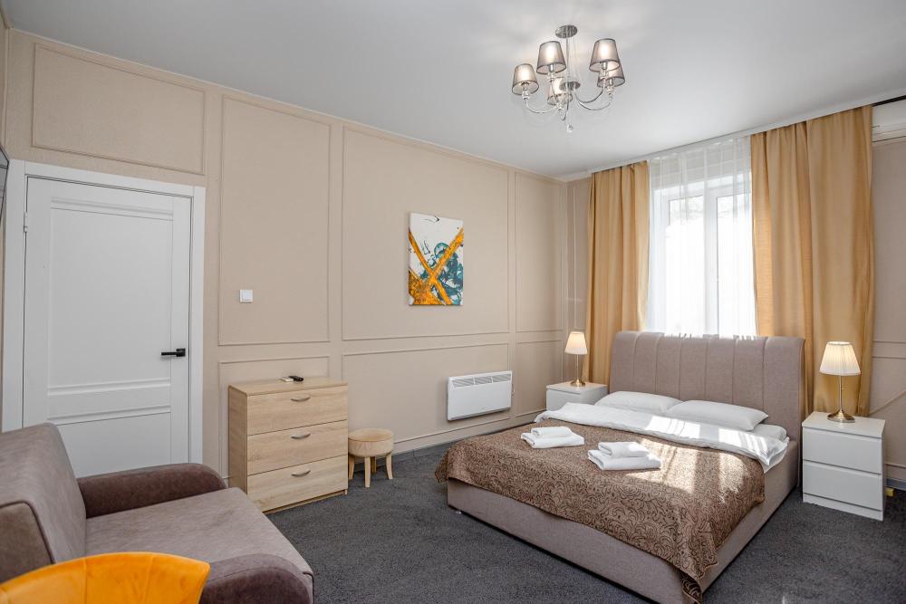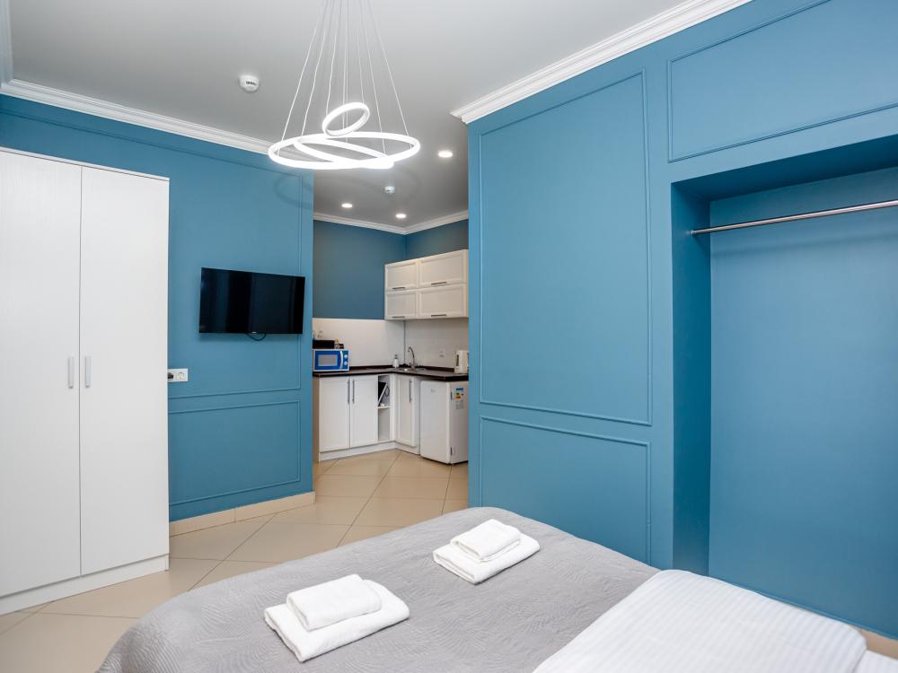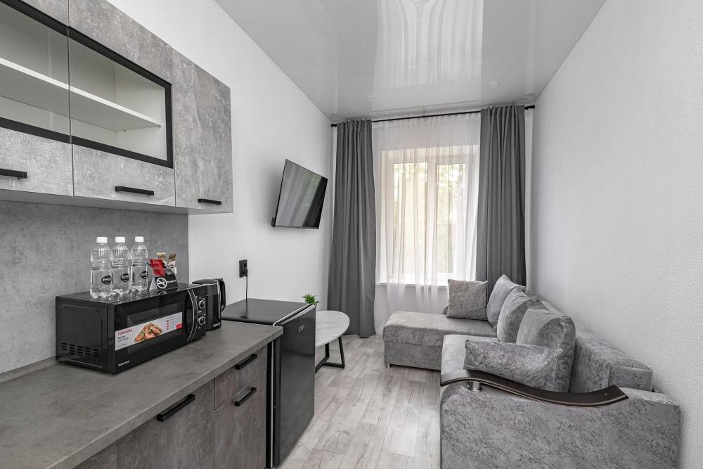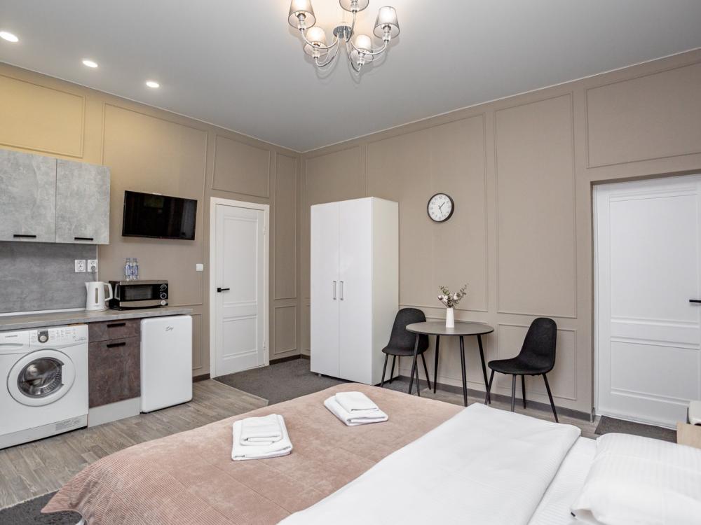 Комфортабельные однокомнатные номера категории "Улучшенный", отличаются немного большей площадью, а также наличием кухни с дополнительным спальным местом (раздвижной диван). Номер сочетает в себе все необходимое для полноценного отдыха для семьи или группы из нескольких человек. Апартаменты соответствуют международным стандартам и выполнены по индивидуальным дизайнерским проектам. Наполнение каждого номера включает: • кровать двуспальная (DBL); • кресло-кровать (уточнять при бронировании); • диван раздвижной; • кухонный гарнитур; • ванная комната с душевой кабиной, сан.узлом, стиральной машиной, туалетными принадлежностями, феном и зеркалом; • кондиционер; • холодильник, микроволновая печь, чайник, печь, полный комплект посуды на 6 персон. • утюг, гладильная доска, сушка для белья; • стол, стул, лампа; • ЖК телевизор; • беспроводной Интернет (Wi-Fi).