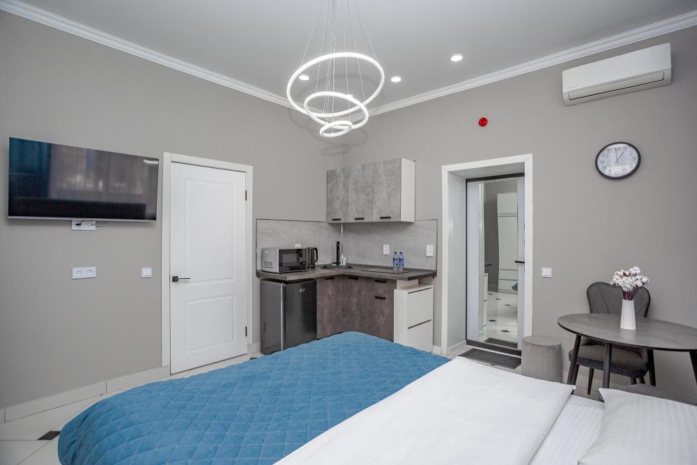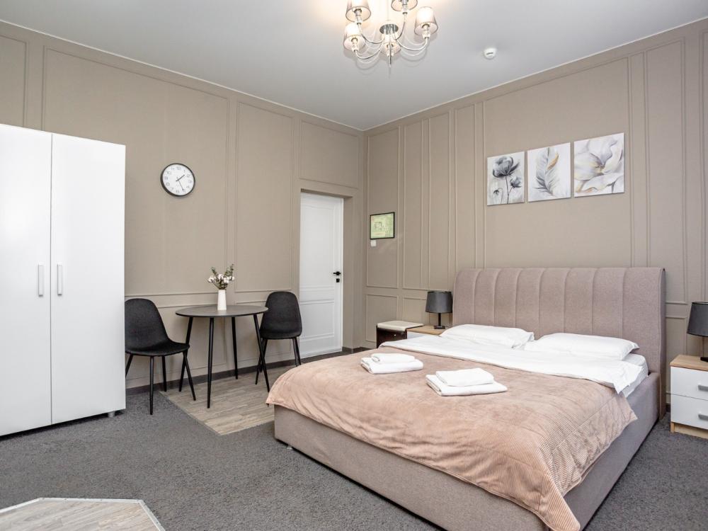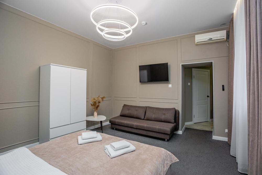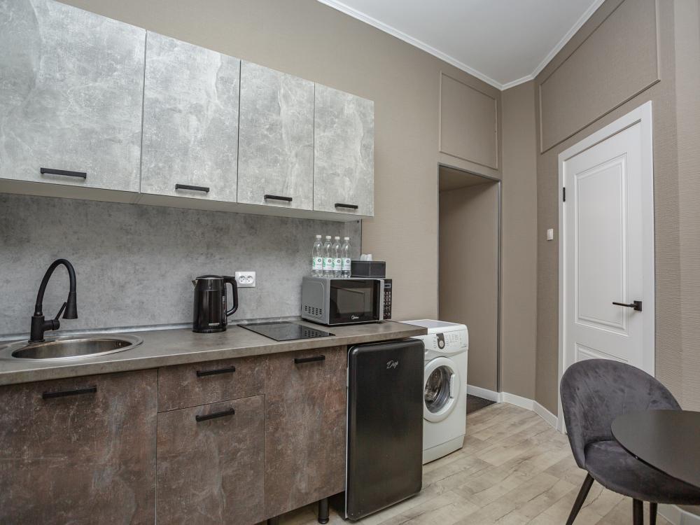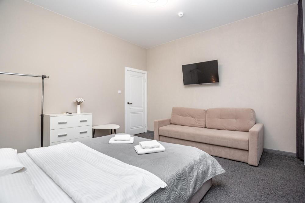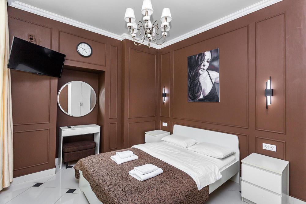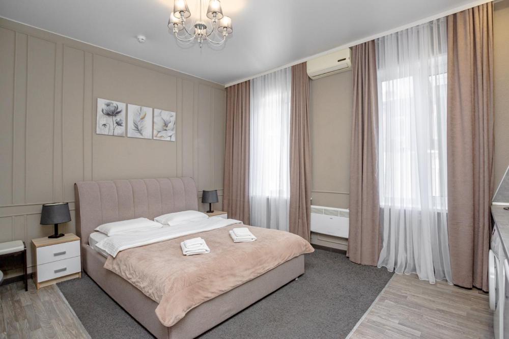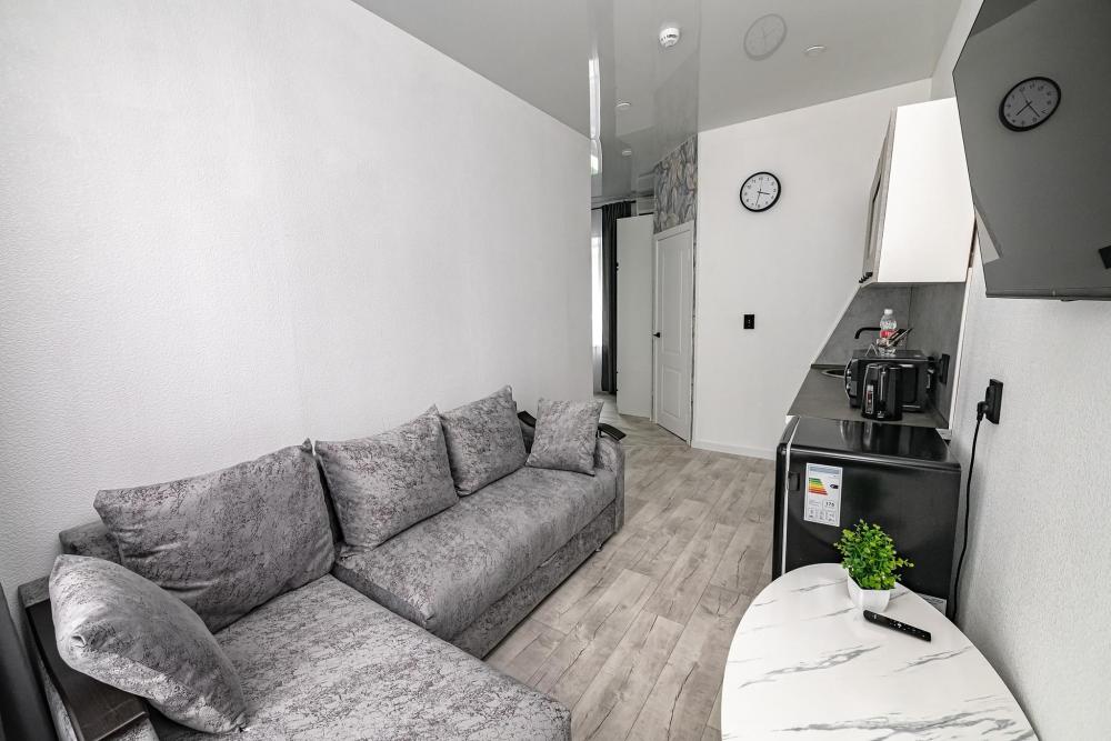 Комфортабельные однокомнатные номера категории "Улучшенный", отличаются немного большей площадью, а также наличием кухни с дополнительным спальным местом (раздвижной диван). Номер сочетает в себе все необходимое для полноценного отдыха для семьи или группы из нескольких человек. Апартаменты соответствуют международным стандартам и выполнены по индивидуальным дизайнерским проектам. Наполнение каждого номера включает: • кровать двуспальная (DBL); • кресло-кровать (уточнять при бронировании); • диван раздвижной; • кухонный гарнитур; • ванная комната с душевой кабиной, сан.узлом, стиральной машиной, туалетными принадлежностями, феном и зеркалом; • кондиционер; • холодильник, микроволновая печь, чайник, печь, полный комплект посуды на 6 персон. • утюг, гладильная доска, сушка для белья; • стол, стул, лампа; • ЖК телевизор; • беспроводной Интернет (Wi-Fi).