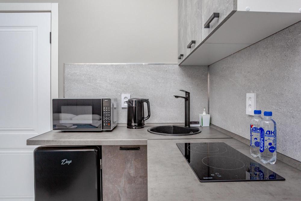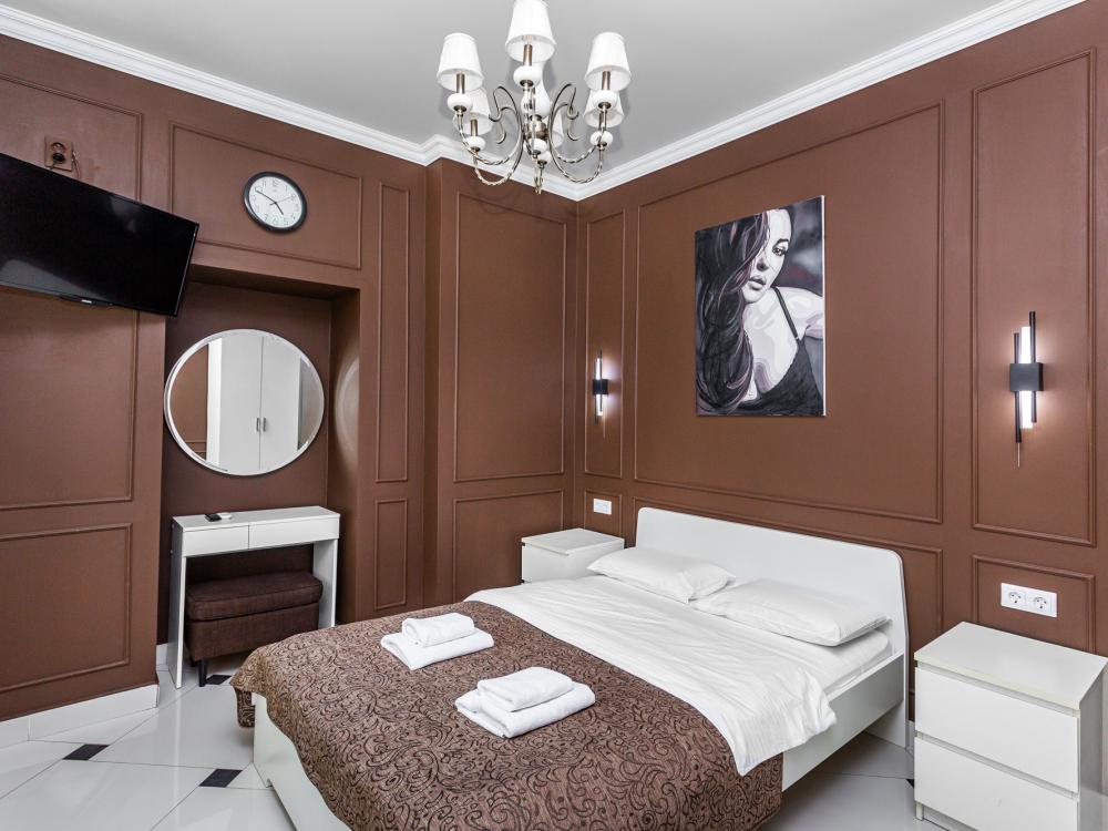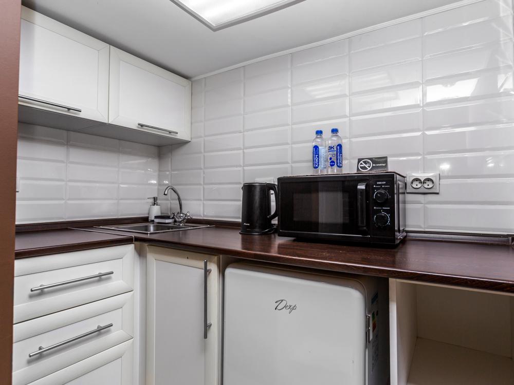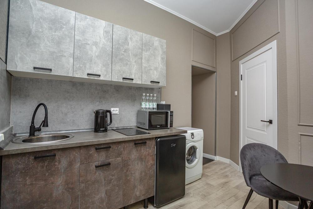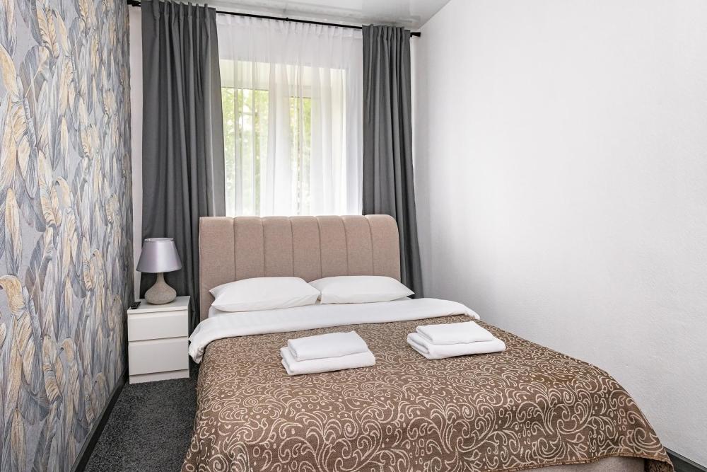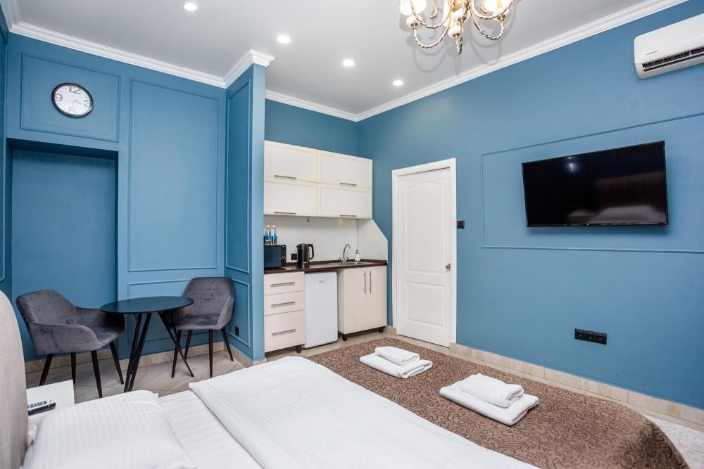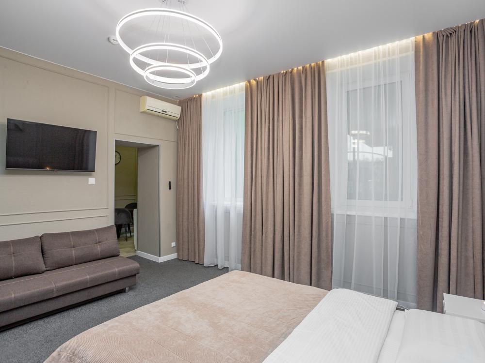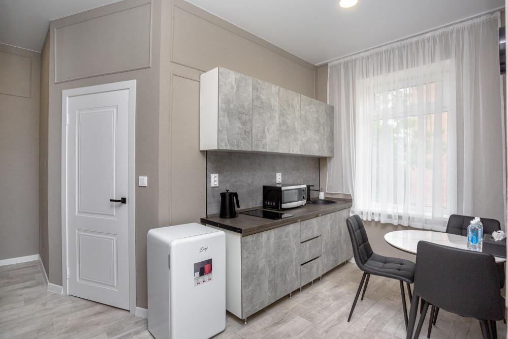 Комфортабельные однокомнатные номера категории "Улучшенный", отличаются немного большей площадью, а также наличием кухни с дополнительным спальным местом (раздвижной диван). Номер сочетает в себе все необходимое для полноценного отдыха для семьи или группы из нескольких человек. Апартаменты соответствуют международным стандартам и выполнены по индивидуальным дизайнерским проектам. Наполнение каждого номера включает: • кровать двуспальная (DBL); • кресло-кровать (уточнять при бронировании); • диван раздвижной; • кухонный гарнитур; • ванная комната с душевой кабиной, сан.узлом, стиральной машиной, туалетными принадлежностями, феном и зеркалом; • кондиционер; • холодильник, микроволновая печь, чайник, печь, полный комплект посуды на 6 персон. • утюг, гладильная доска, сушка для белья; • стол, стул, лампа; • ЖК телевизор; • беспроводной Интернет (Wi-Fi).