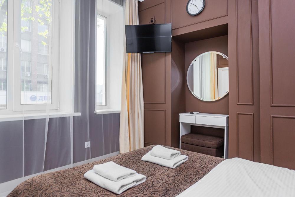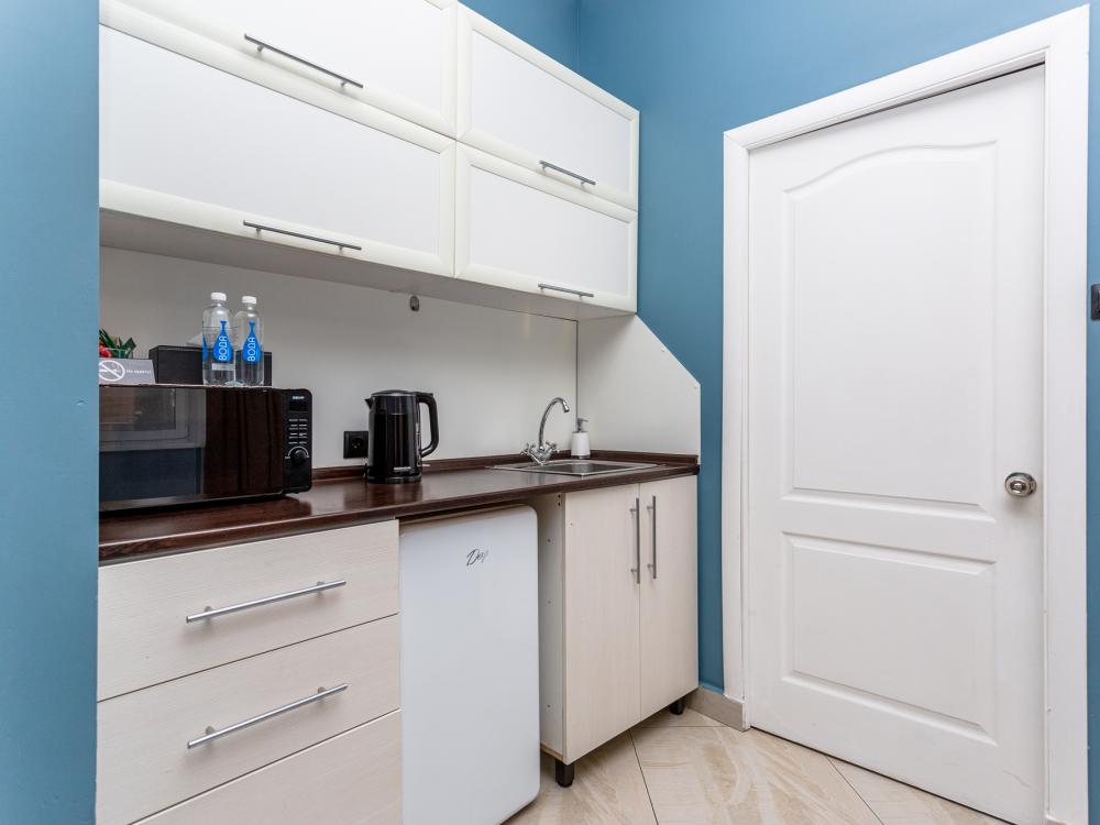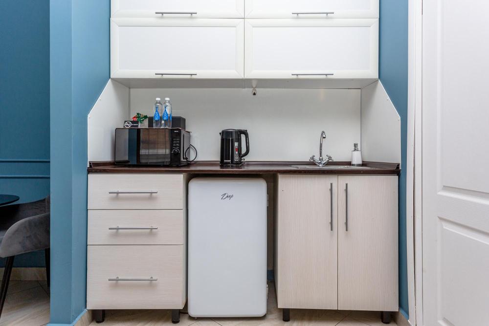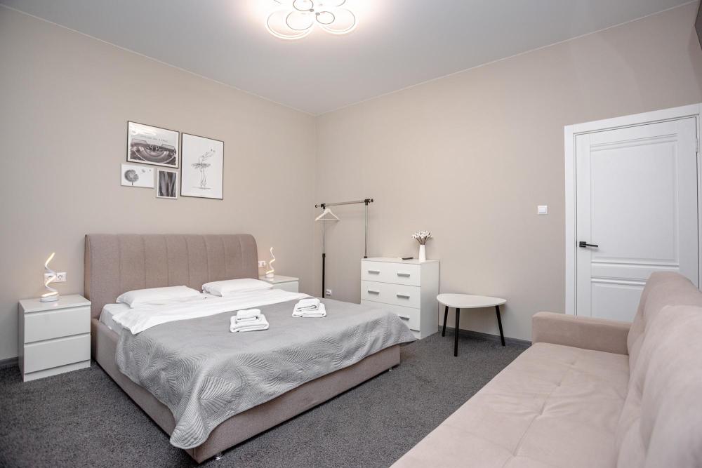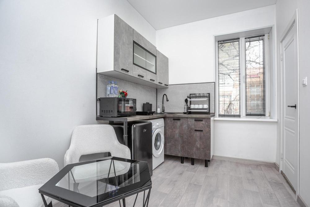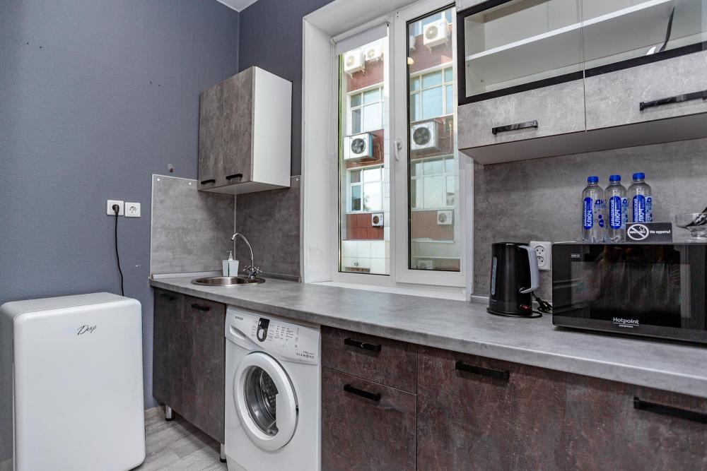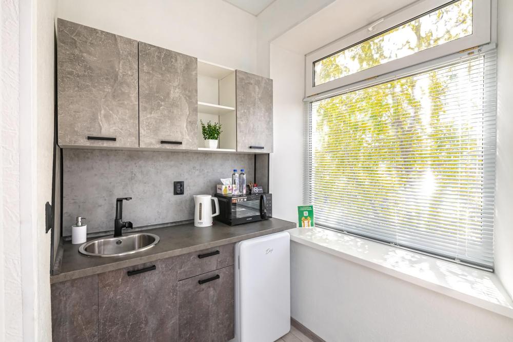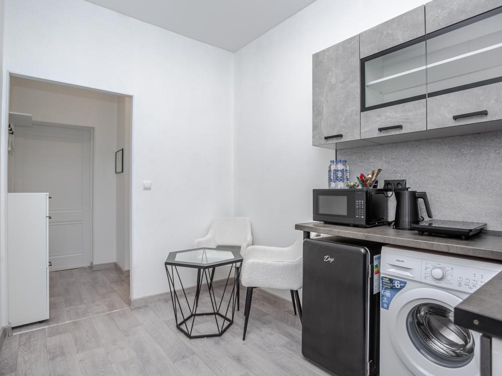 Комфортабельные однокомнатные номера категории "Улучшенный", отличаются немного большей площадью, а также наличием кухни с дополнительным спальным местом (раздвижной диван). Номер сочетает в себе все необходимое для полноценного отдыха для семьи или группы из нескольких человек. Апартаменты соответствуют международным стандартам и выполнены по индивидуальным дизайнерским проектам. Наполнение каждого номера включает: • кровать двуспальная (DBL); • кресло-кровать (уточнять при бронировании); • диван раздвижной; • кухонный гарнитур; • ванная комната с душевой кабиной, сан.узлом, стиральной машиной, туалетными принадлежностями, феном и зеркалом; • кондиционер; • холодильник, микроволновая печь, чайник, печь, полный комплект посуды на 6 персон. • утюг, гладильная доска, сушка для белья; • стол, стул, лампа; • ЖК телевизор; • беспроводной Интернет (Wi-Fi).
