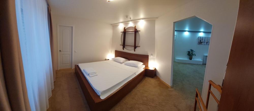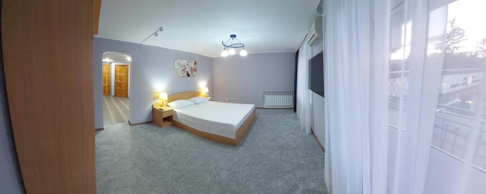 Люкс - двухкомнатный номер (60 кв.м.) с лоджией. В зависимости от расположения номера из окон открывается вид на центр города, либо на акваторию Цимлянского водохранилища. В спальне имеется двуспальная кровать, шкаф-купе. В просторной гостиной - мягкая мебель,рабочий стол, телевизор, сплит-система, холодильник, электрический чайник. В ванной комнате имеется фен, гигиенические принадлежности. Уборка номера и смена постельного белья и полотенец производится ежедневно.