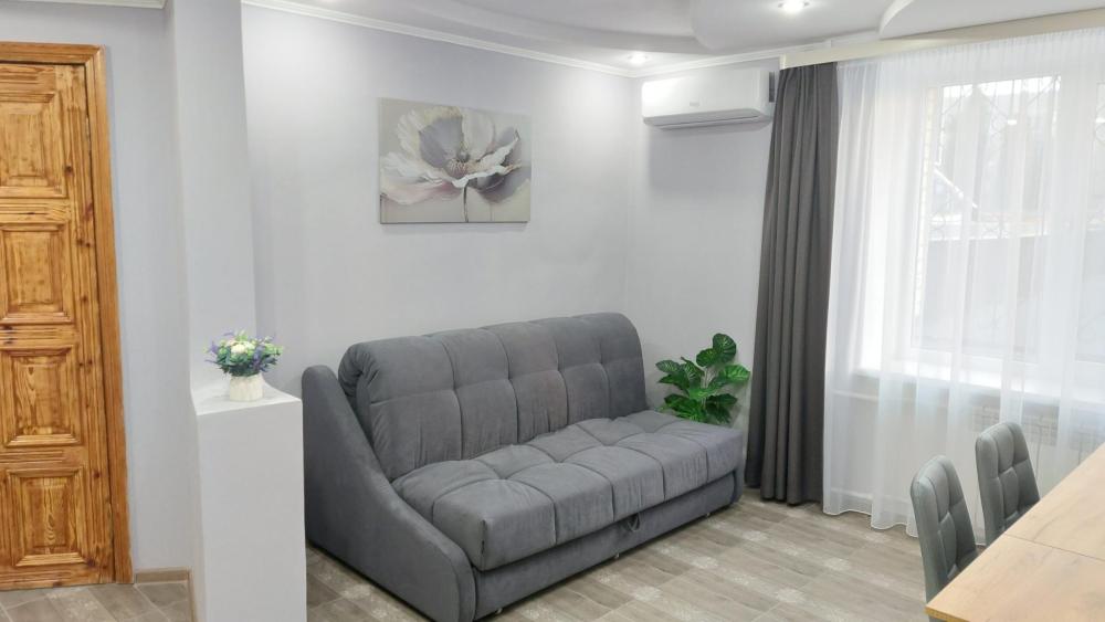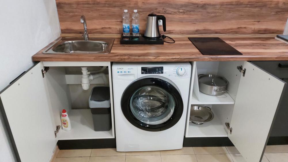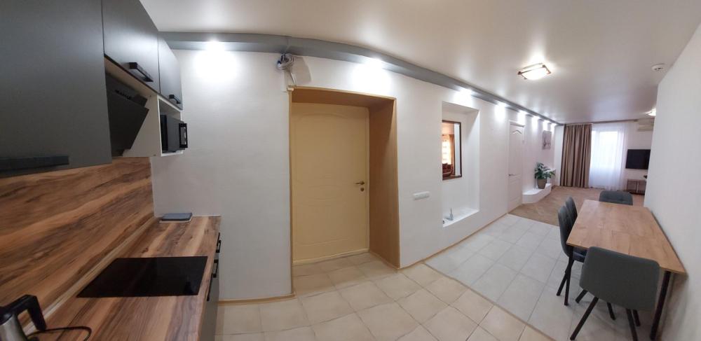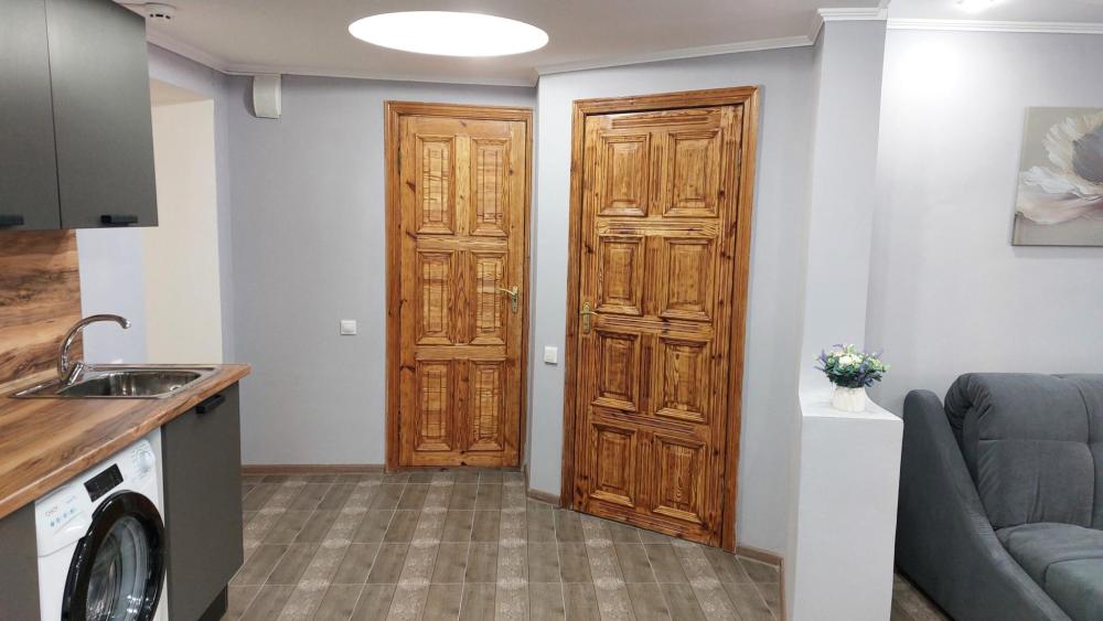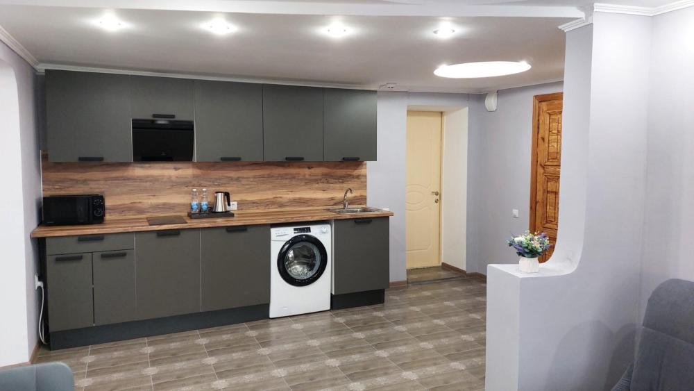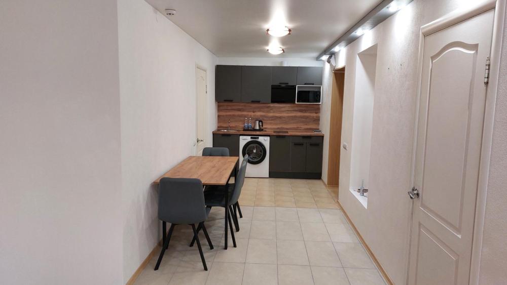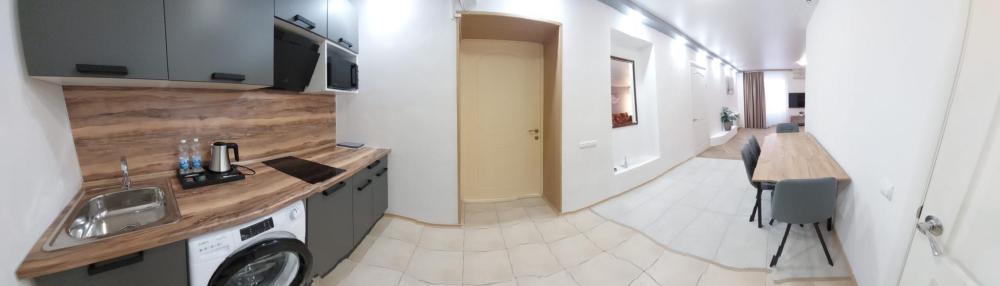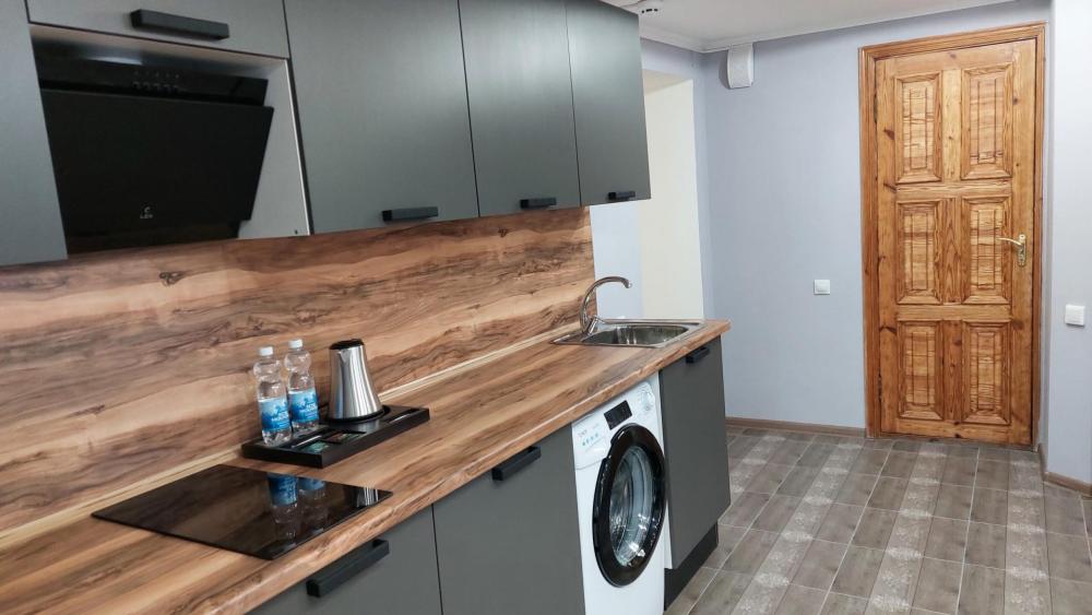 Просторный 2-х комнатный номер (апартаменты) с большой двуспальной кроватью и диваном. В каждом номере: – раздельный санузел – полностью оснащенная кухня – стиральная машина – телевизор – климатическая система – холодильник – чайник – вода, чай, кофе