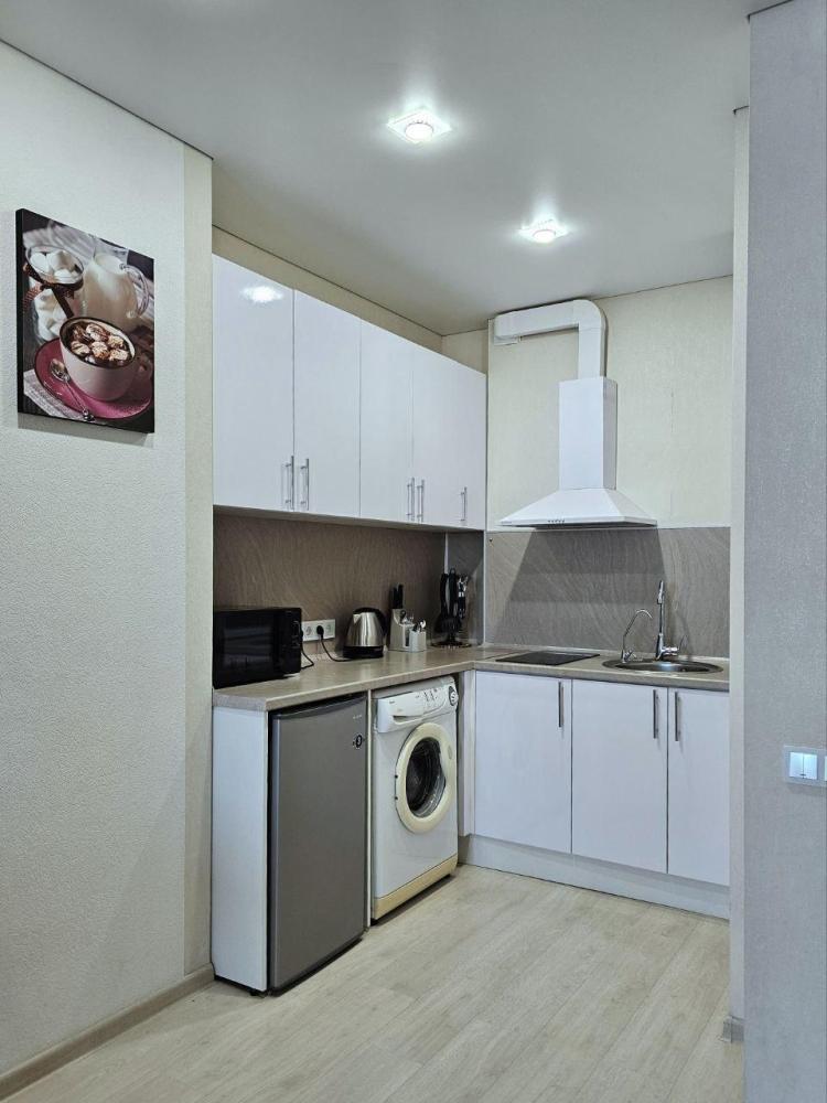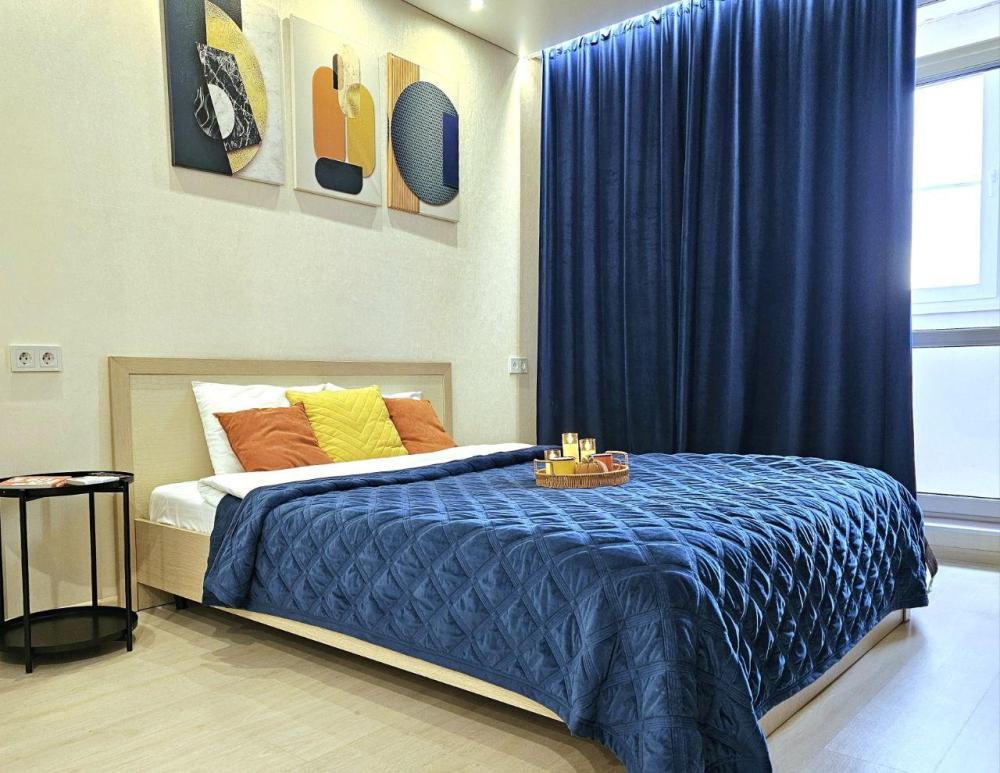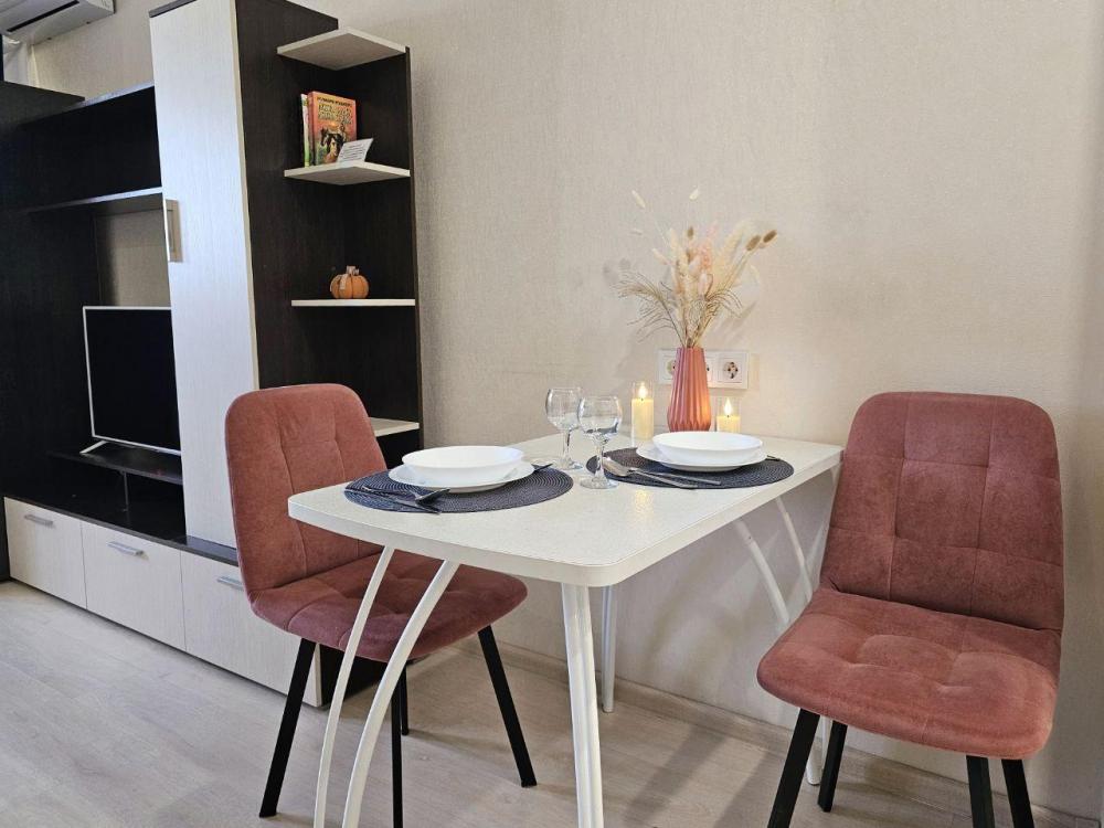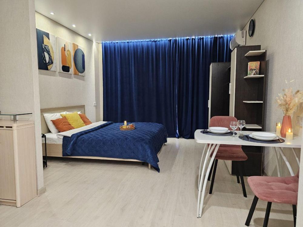 Комфортабельная студия для отдыха и проживания. Предусмотрено размещение до 2 человек, в студии есть двуспальная кровать. Курение в квартире запрещено. Апартаменты включают в себя: - Мультимедиа: WI-FI, Проводной интернет, Цифровое кабельное тв (120 каналов, 30 HD ) - Новая бытовая техника: жк тв, стиральная машинка, микроволновка, холодильник, сплит система, утюг, фен, чайник, фильтр для очистки воды и качественная немецкая сантехника. - Дополнительно: Спальные принадлежности по гостиничному классу люкс (белые сатиновые простыни, махровые полотенца). Средства гигиены, набор хорошей посуды и столовых принадлежностей - Удобства: Двуспальная кровать, кухонный гарнитур. Кухонный стол и два стула.