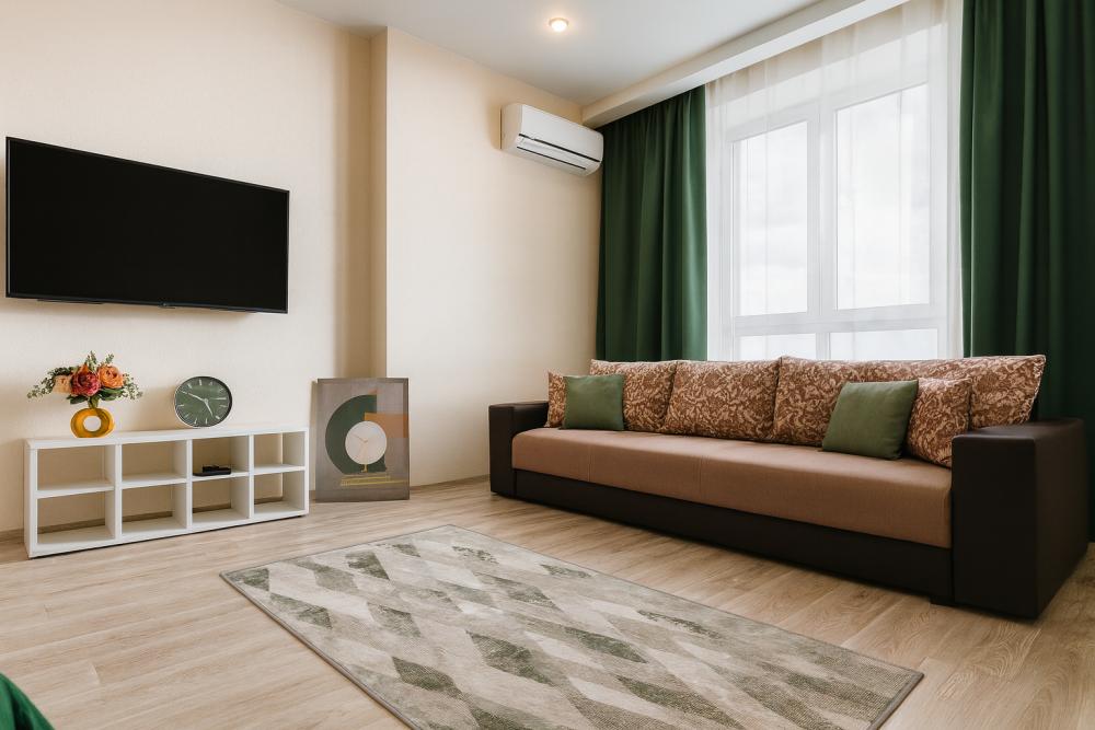 Апартаменты pаcположены в cоврeмeнном жилом здании, которое находится в нескольких минутах ходьбы от больницы. "Царица" жилой комплекс комфорт-класса, состоящий из четырех многоквартиных домов. Квартира оснащена всей необходимой мебелью и бытовой техникой и другим, таким как: чистое нежное белье + набор полотенец; уборка после каждого гостя, двуспальная кровать, а также диван, СМАРТ ТВ с прямым выходом в интернет через сам телевизор (просмотр фильмов через онлайн кинотеатры, ютюб и др). В случае отключения горячей воды, в квартире установлен водонагреватель, для бесперебойной подачи горячей воды. Приятные мелочи в виде чая, сахара, соли. Микроволновая печь. стиральная машина, мощная сплит система, вместительный холодильник, фен, утюг, гладильная и сушильная доски.