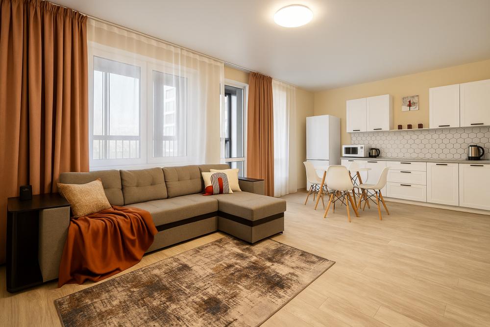 ЖК Цех - новый жилой комплекс в Волгограде. Большая квартира, с отдельной кухонной зоной и выделенной спальной зоной. Современный ремонт и новая техника. Максимально количество гостей - 4 гостя, есть большая и просторная лоджия с подвесным креслом-коконом и зоной отдыха. Квартира оснащена всей необходимой мебелью и бытовой техникой и другим, таким как: чистое белое нежное белье + набор полотенец; уборка после каждого гостя двуспальная кровать, а также диван; СМАРТ ТВ с прямым выходом в интернет через сам телевизор (просмотр фильмов через онлайн кинотеатры, ютюб и др). В случае отключения горячей воды, в квартире установлен водонагреватель, для бесперебойной подачи горячей воды. Приятные мелочи в виде чая, сахара, соли. Микроволновая печь. стиральная машина, мощная сплит система, вместительный холодильник, подвесное кресло-кокон для релаксирования, а также зона отдыха, расположенные на огромной лоджии с выходом во двор; фен, утюг, гладильная и сушильная доски.