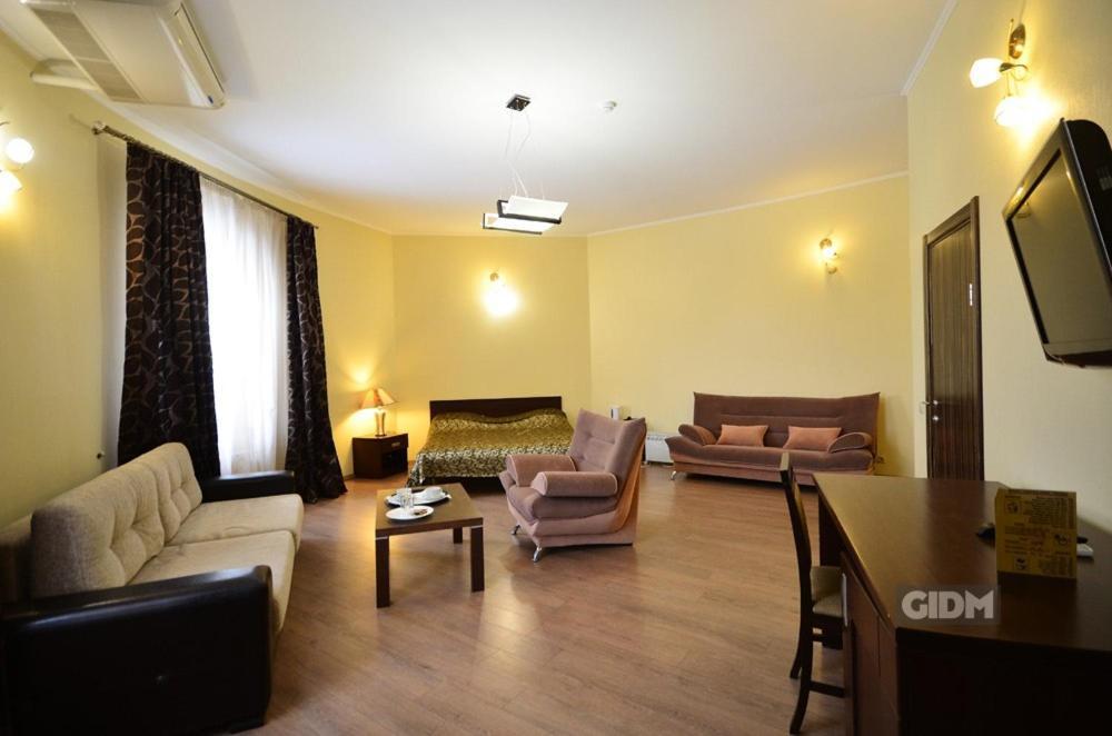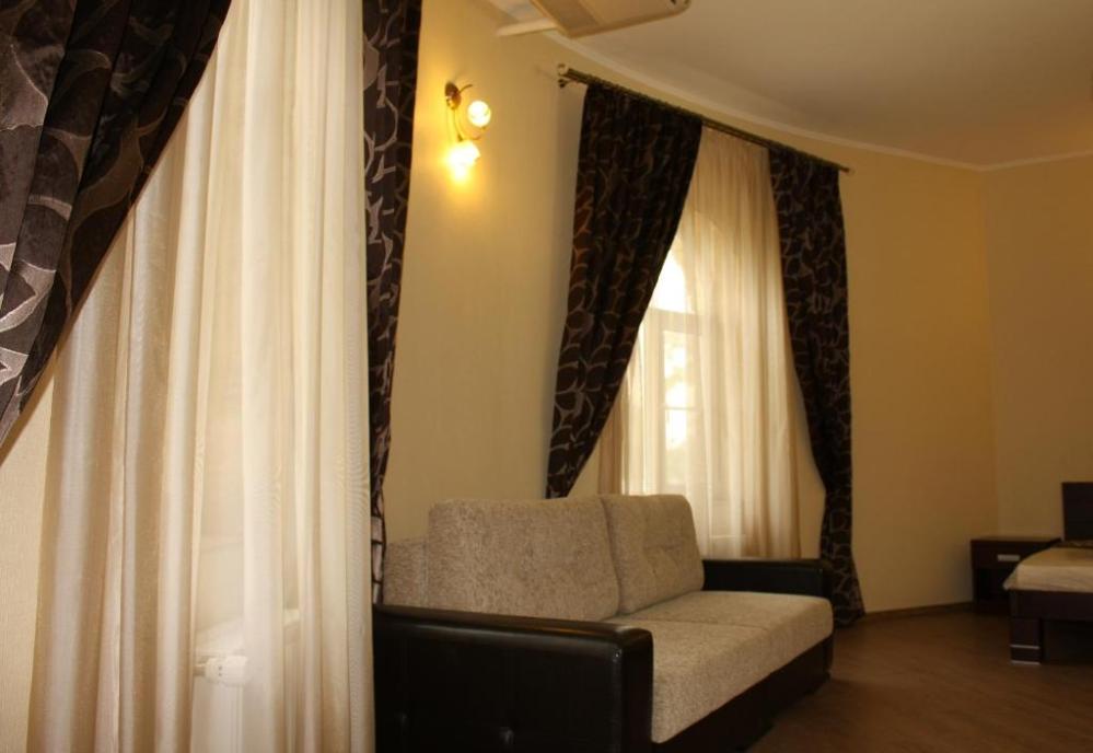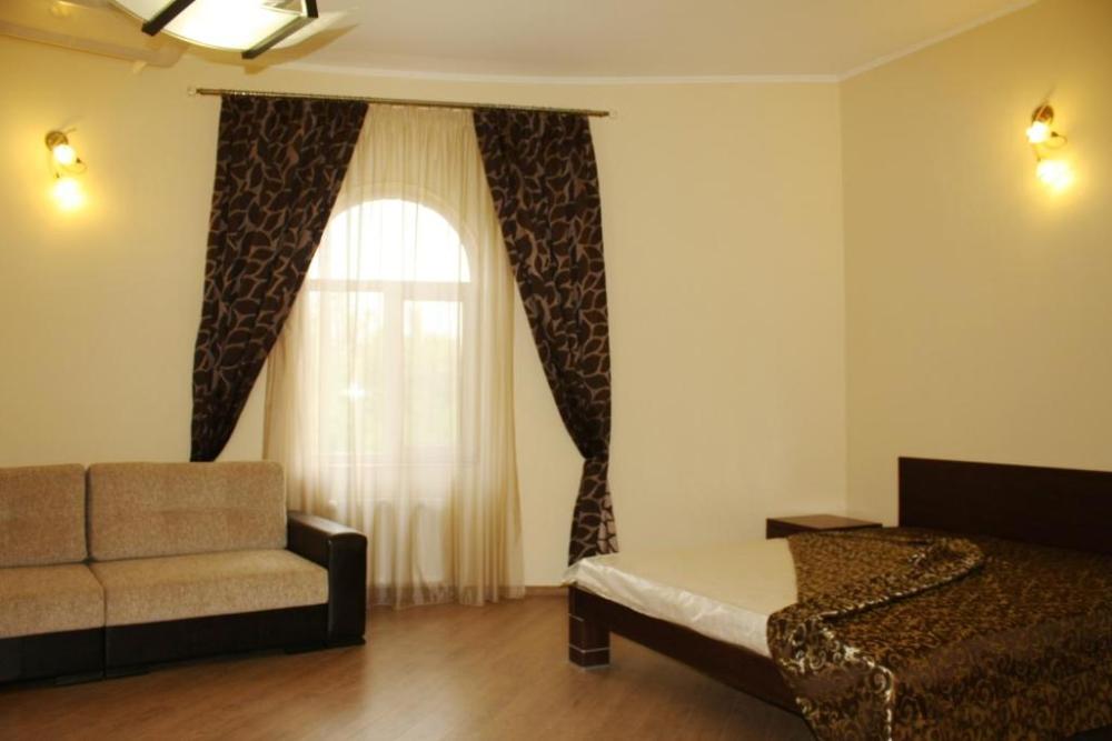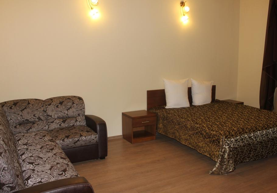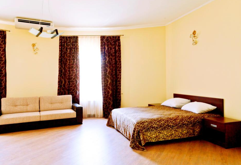 Просторный номер с двуспальной кроватью, мягкой мебелью, телевизором и сплит-системой.