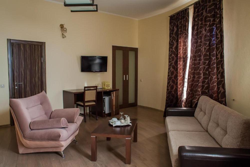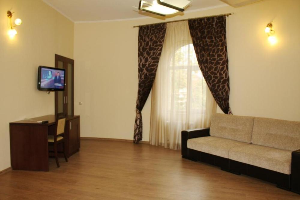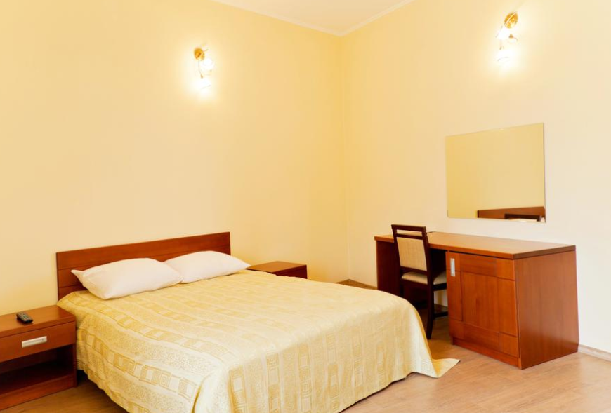 Просторный номер с двуспальной кроватью, мягкой мебелью, телевизором и сплит-системой. В ванной комнате: джакузи, биде, туалетно-косметические принадлежности.