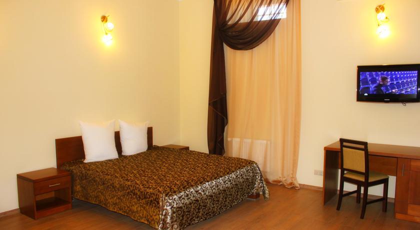 В номере большая кровать, телевизор, холодильник, рабочий стол, собственная ванная комната.