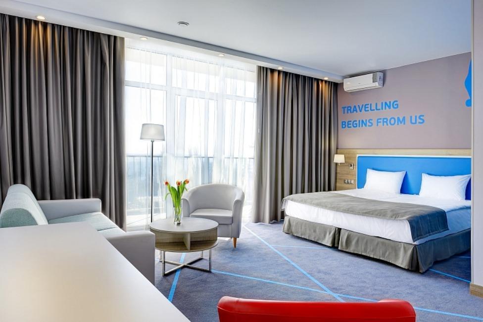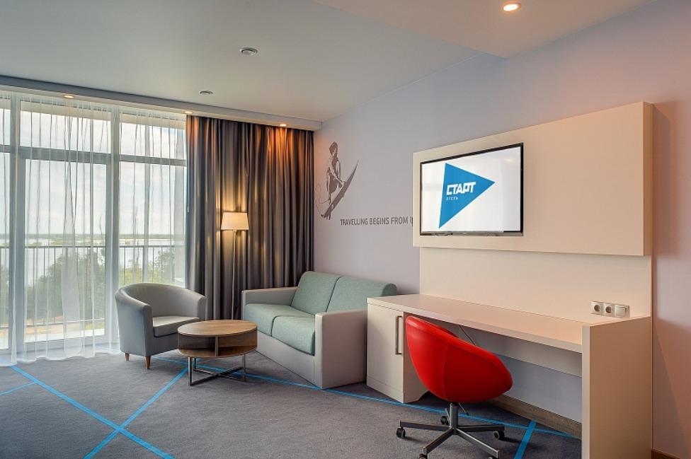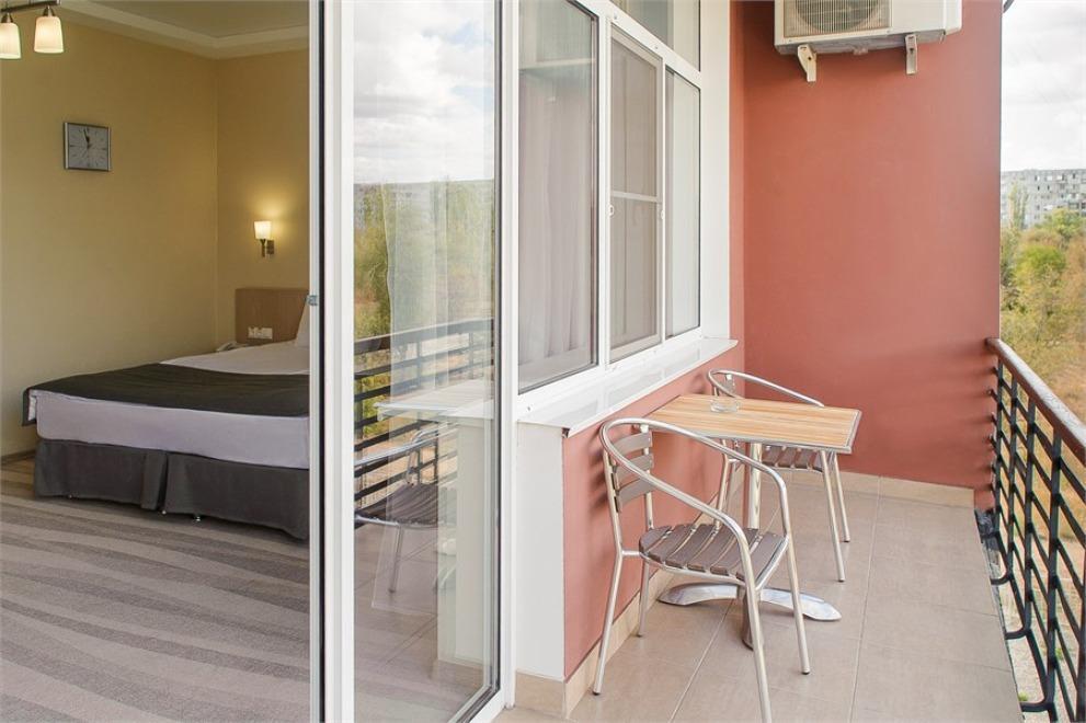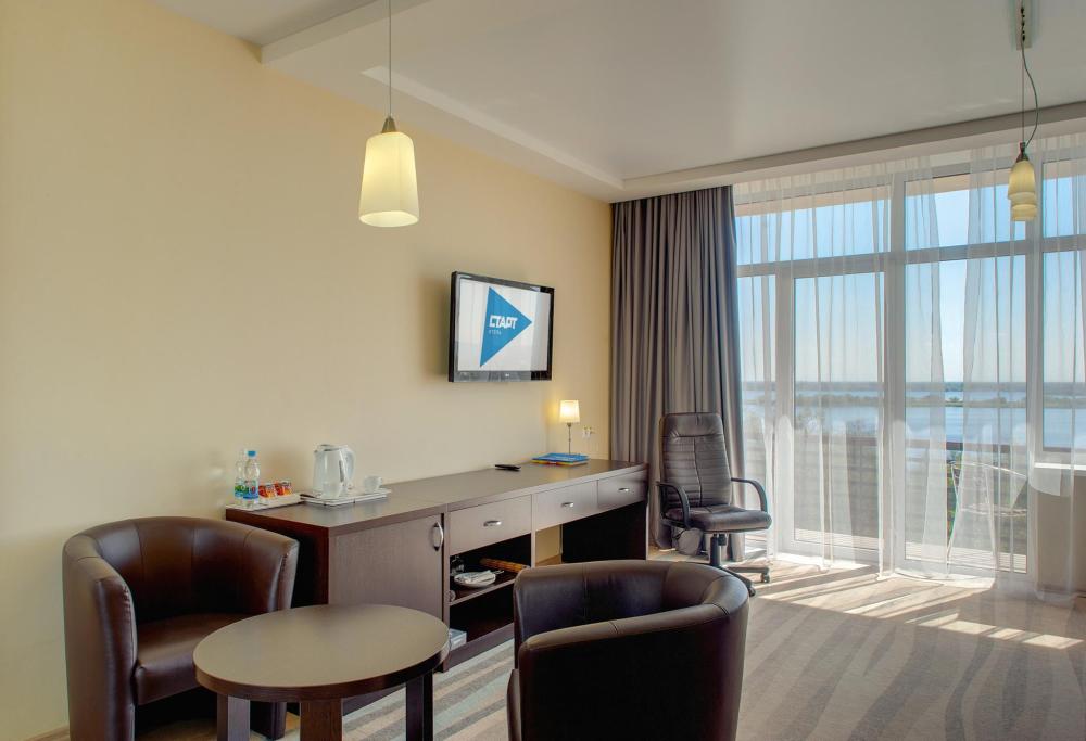 Одна большая комната, в номере: кровать queen-size c возможностью предоставления двух раздельных кроватей, два прикроватных столика, журнальный столик, два кресла, рабочий стол, рабочее кресло, шкаф-купе, стол и стулья на лоджии, сплит-система, сейф, фригобар, цифровое ТВ, утюг и гладильная доска, электрический чайник, фен, набор посуды на две персоны, телефон, беспроводной интернет,комплект средств личной гигиены, лосьон и молочко для тела, минеральная вода, чай, кофе, сливки, сахар, печенье.
