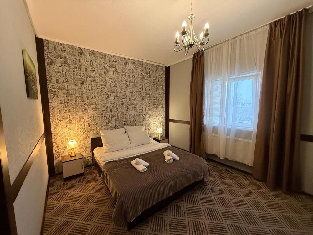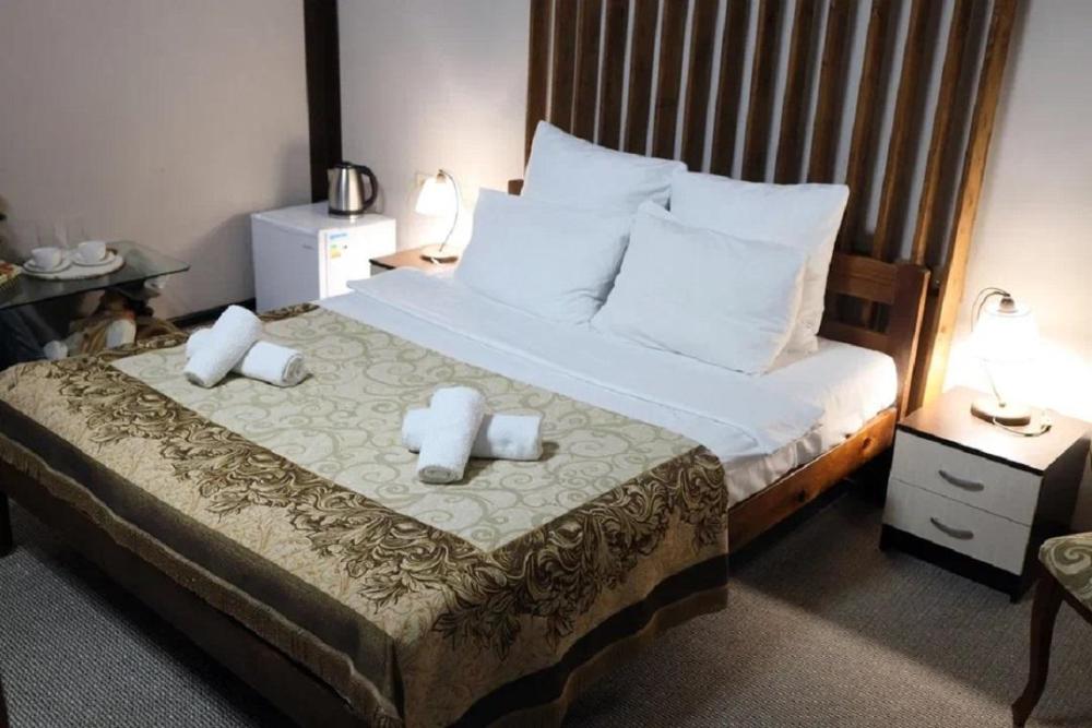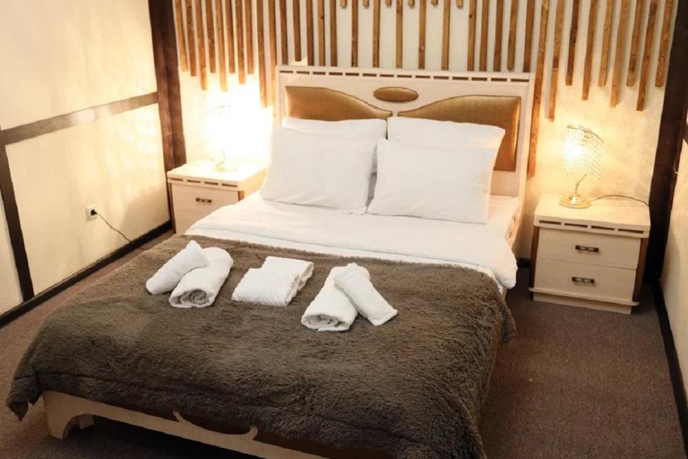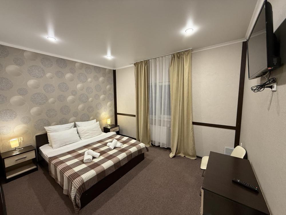Площадь номера:35 м2 В номере:двуспальная кровать, шкаф, прикроватные тумбочки, пуфик, зеркало, светильник, комод, телевизор.