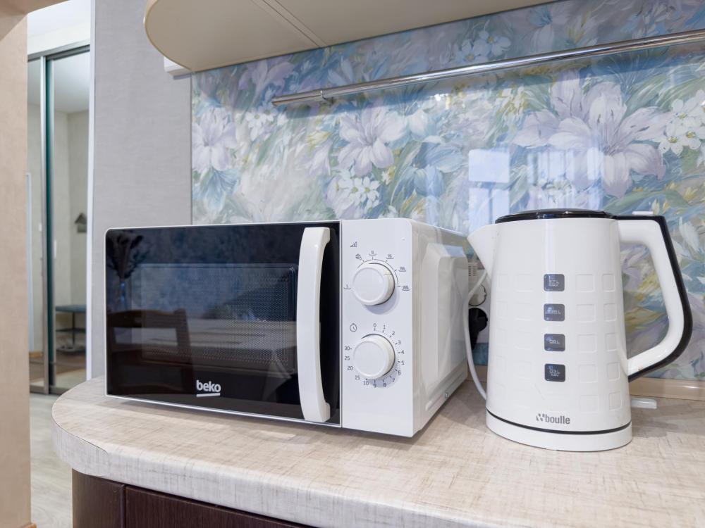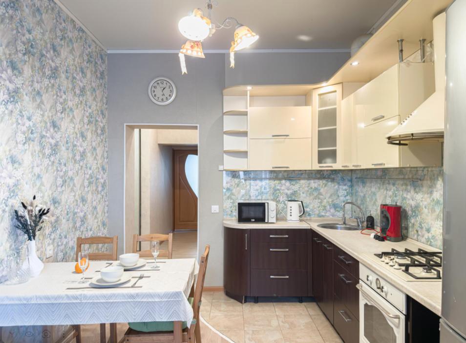Холодильник, посуда, микроволновка, варочная панель, духовой шкаф, чайник,