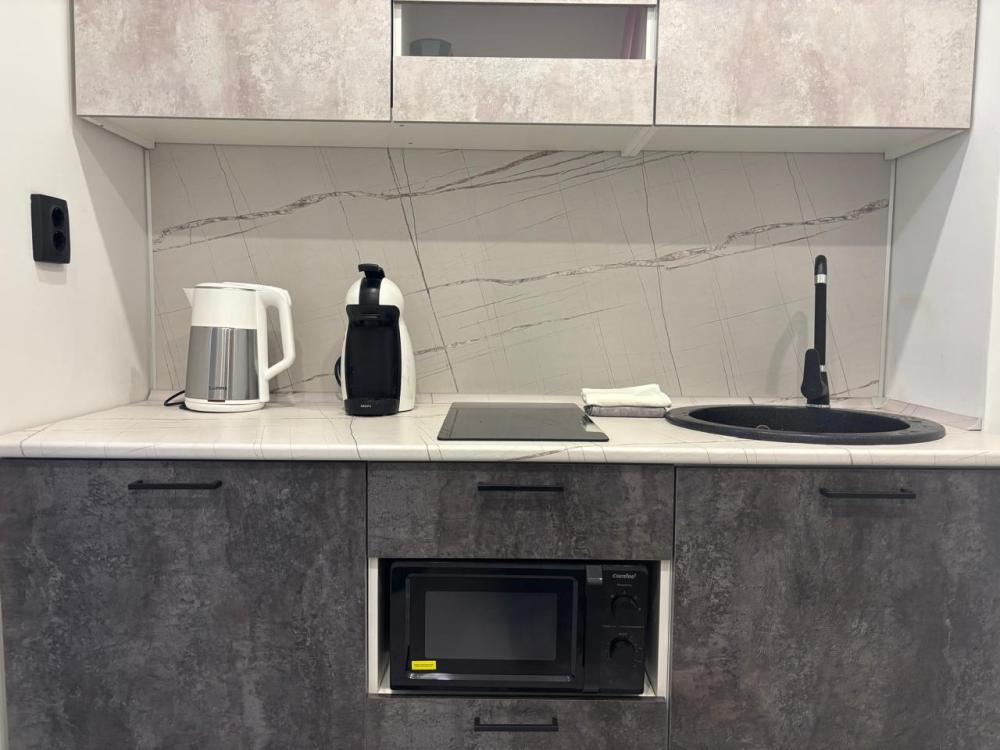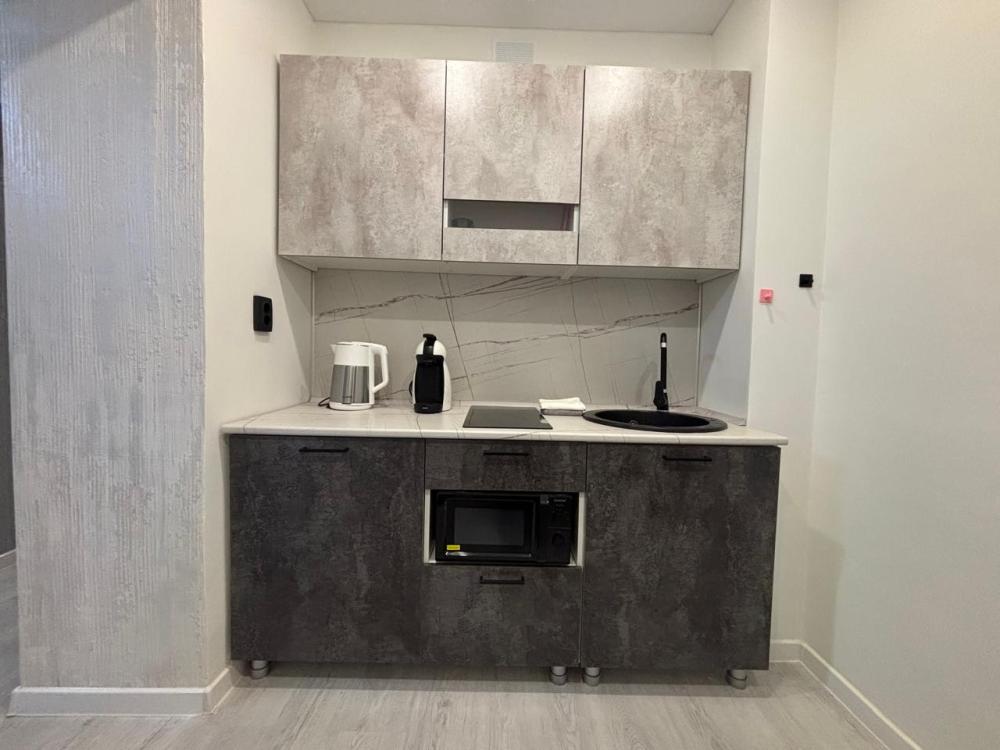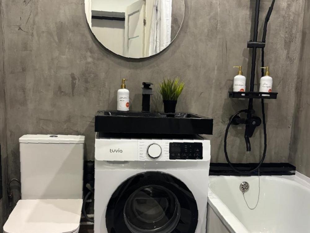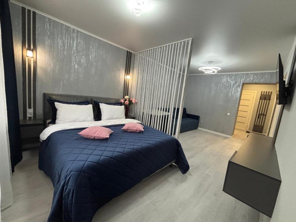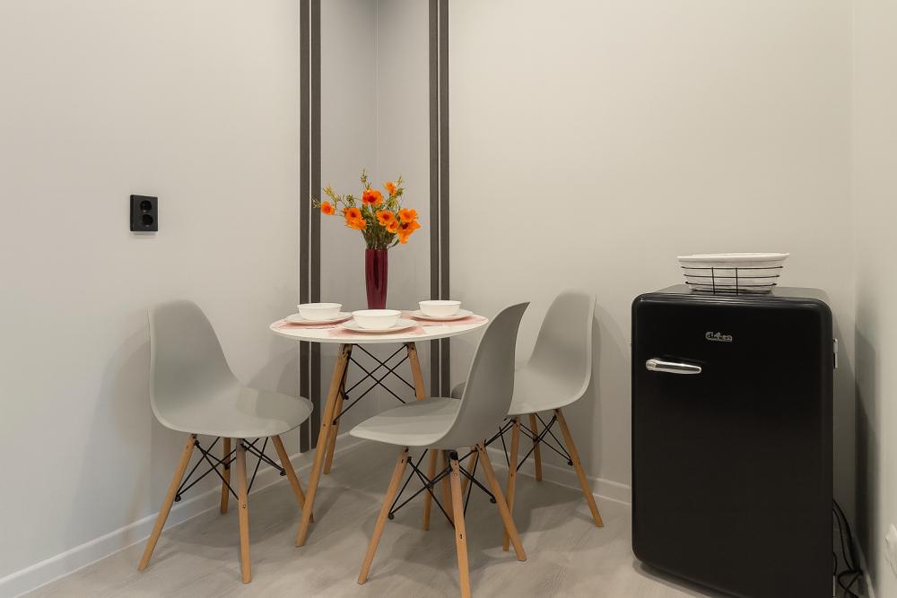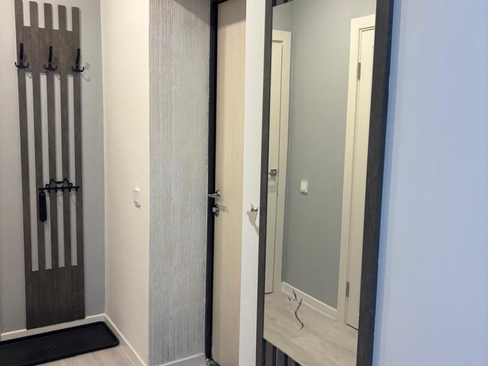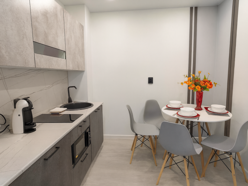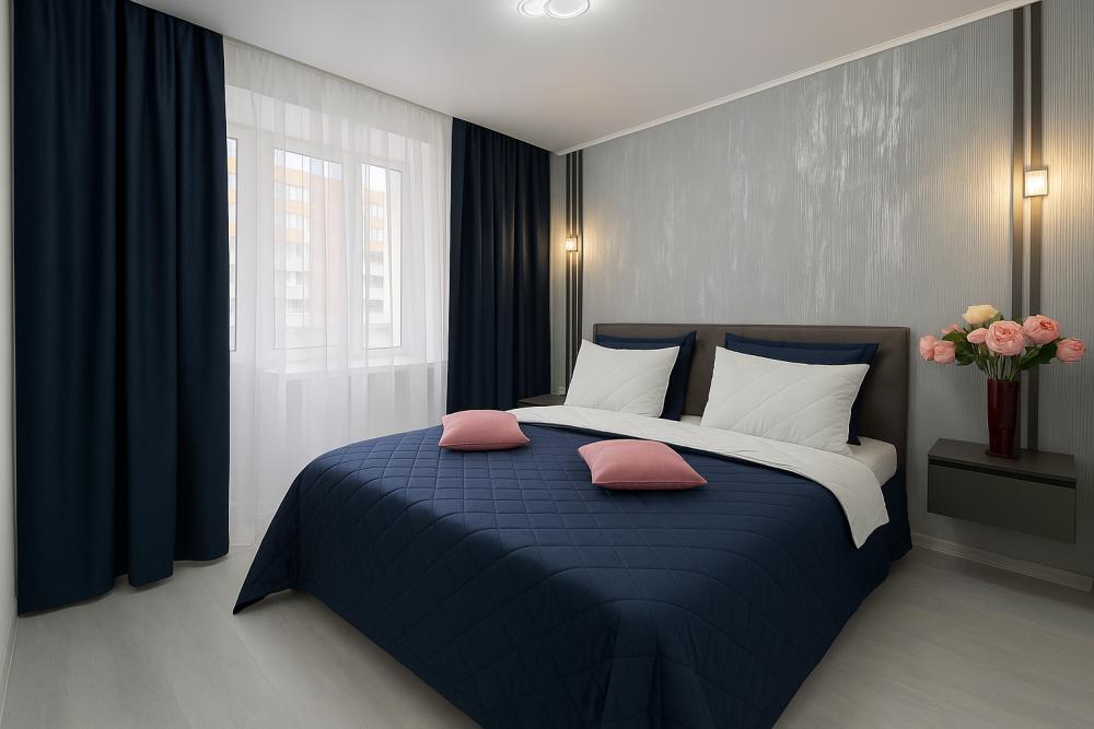 Апартаменты вместимостью до 5 человек. Апартаменты расположены на 5 этаже. В апартаментах есть все, что необходимо для проживания: двуспальная кровать, раскладной диван и кресло, постельное белье и полотенца, лоджия, телевизор, Wi-Fi, встроенная плита, микроволновая печь, холодильник, обеденный стол и стулья, посуда, электрический чайник, гигиенические и гладильные принадлежности, стиральная машина, фен.