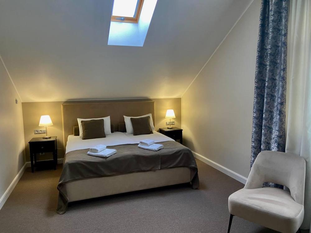 Мансардный ,светлый номер с раздельными кроватями .В номере располагаются две односпальные кровати с ортопедическими матрасами, шкаф, зеркало, рабочее место, прикроватные тумбы и светильники, торшер, телевизор, холодильник, ванная комната с душевой
