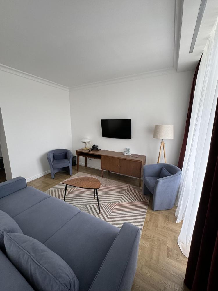 Трехкомнатный номер с гостиной, спальней и комнатой отдыха. Ванная комната с джакузи и душевой кабиной, ванная комната с гидромассажным душем (в спальне), фен, сауна, туалетная комната. 2 цветных TV, DVD, минихолодильник, кондиционер, фен, ноутбук, телефон, сейф.
