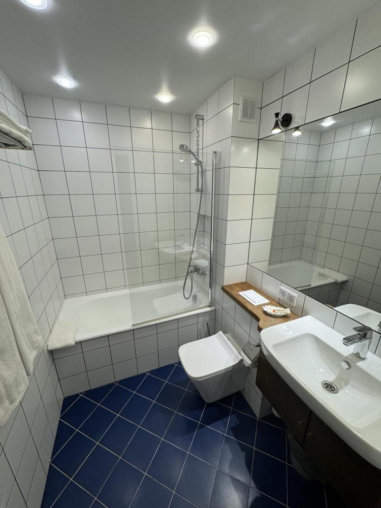 Номер площадью 12 кв. м. с полуторной кроватью и балконом. В номере туалетная комната с душевой кабинкой, фен. Оборудование номеров составляет: LED телевизор со спутниковым и кабельным ТВ, мини-холодильник, телефон, рабочий стол, Wi-Fi.