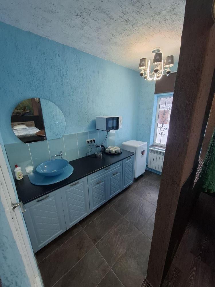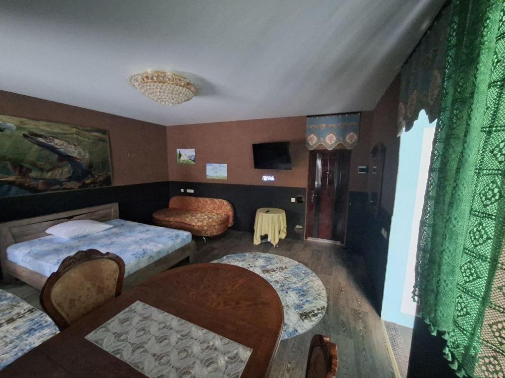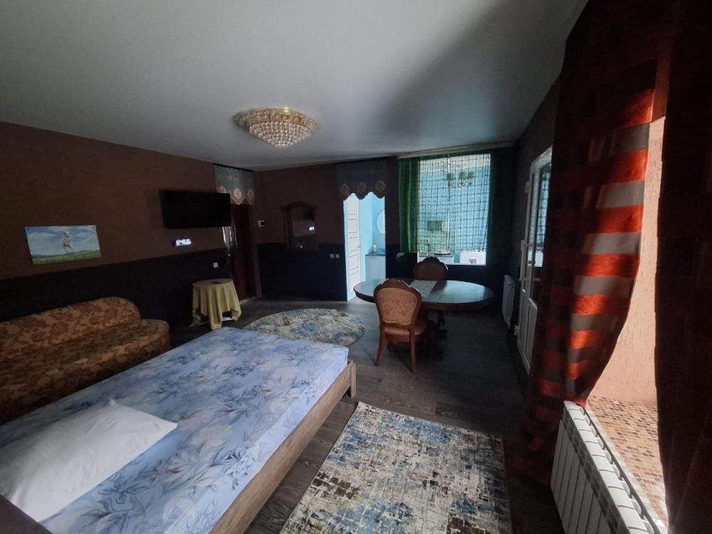 Большой номер с кухней. Общая площадь 36 кв м . Отдельная кухонная зона оборудована холодильником, микроволновой печью, чайником, набором посуды . Сам апартамент оборудован большой 2-спальной кроватью шириной 160 см, раскладным диваном , большим обеденным столом из натурального дерева и телевизора.