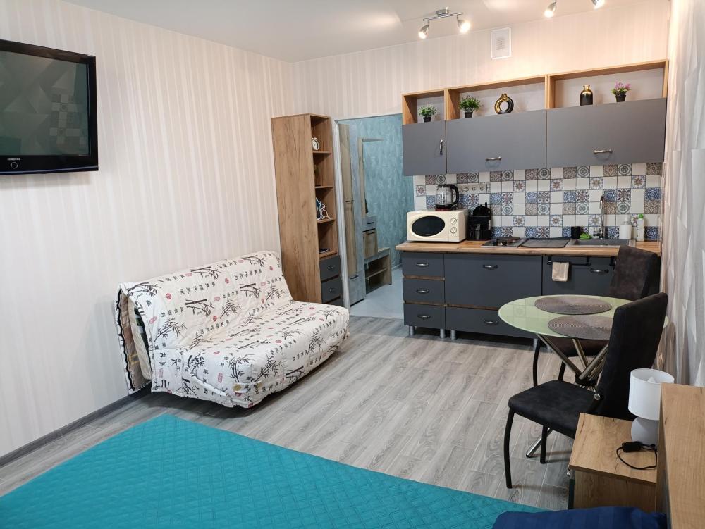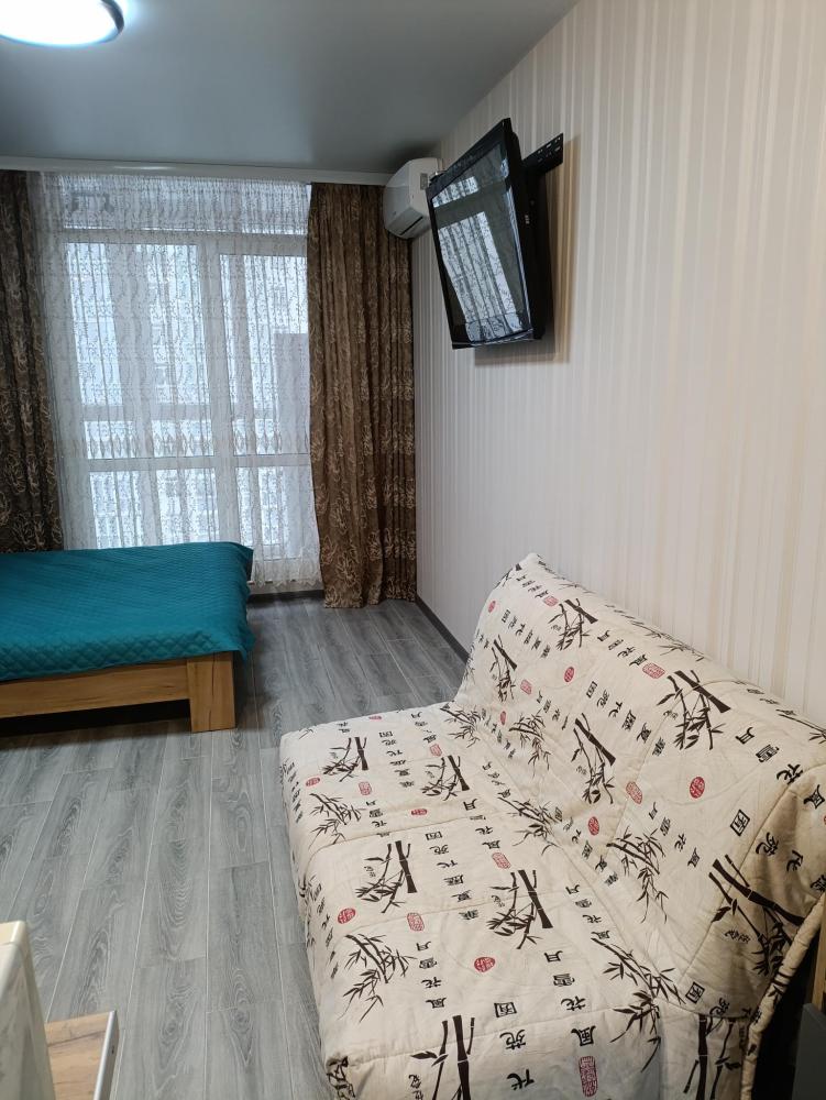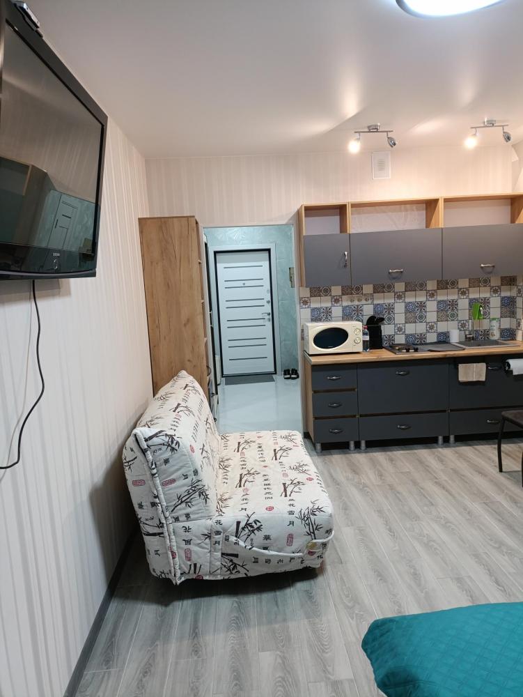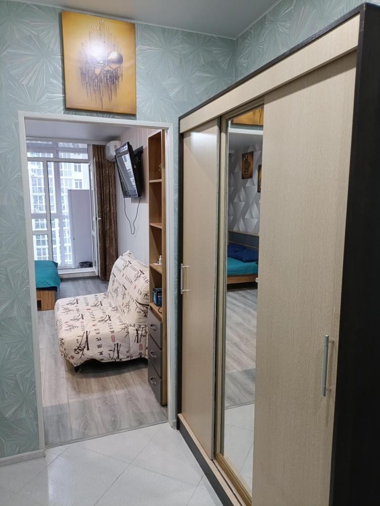 Студия с качественным ремонтом, на 6 этаже 17-ти этажного дома. Дом расположен в жилом комплексе "Атмосфера". В доме есть грузовой и пассажирский лифт, консьерж, система видеонаблюдения по этажно . С одной и с другой стороны дома- детские площадки , по периметру дома газон. В шаговой доступности аквапарк ,продуктовые магазины, кафе, мойка машин , парковочные места для автотранспорта и другое. Территория огорожена по всему периметру забором. Вьезд в жилой комплекс через шлагбаум. О квартире: студия 27м кв. мебелирована всем необходимым для комфортного проживания. В ванной комнате (туалет) установлены новая ванна, стиральная машинка, умывальник. В коридоре стоит шкаф. В комнате зона кухни и зона отдыха. Кухонный гарнитур новый , электроплита, чайник, посуда, микроволновая печь, и др. В комнате большая двухспальная кровать( новая) , столик стеклянный , стулья, диванчик (раскладной), телевизор , сплит-система , холодильник , шкаф-пенал(новый). Лоджия большая ( 4,4 кв.м.) с прекрасным видом во двор с панорамными окнами. Скоростной интернет.