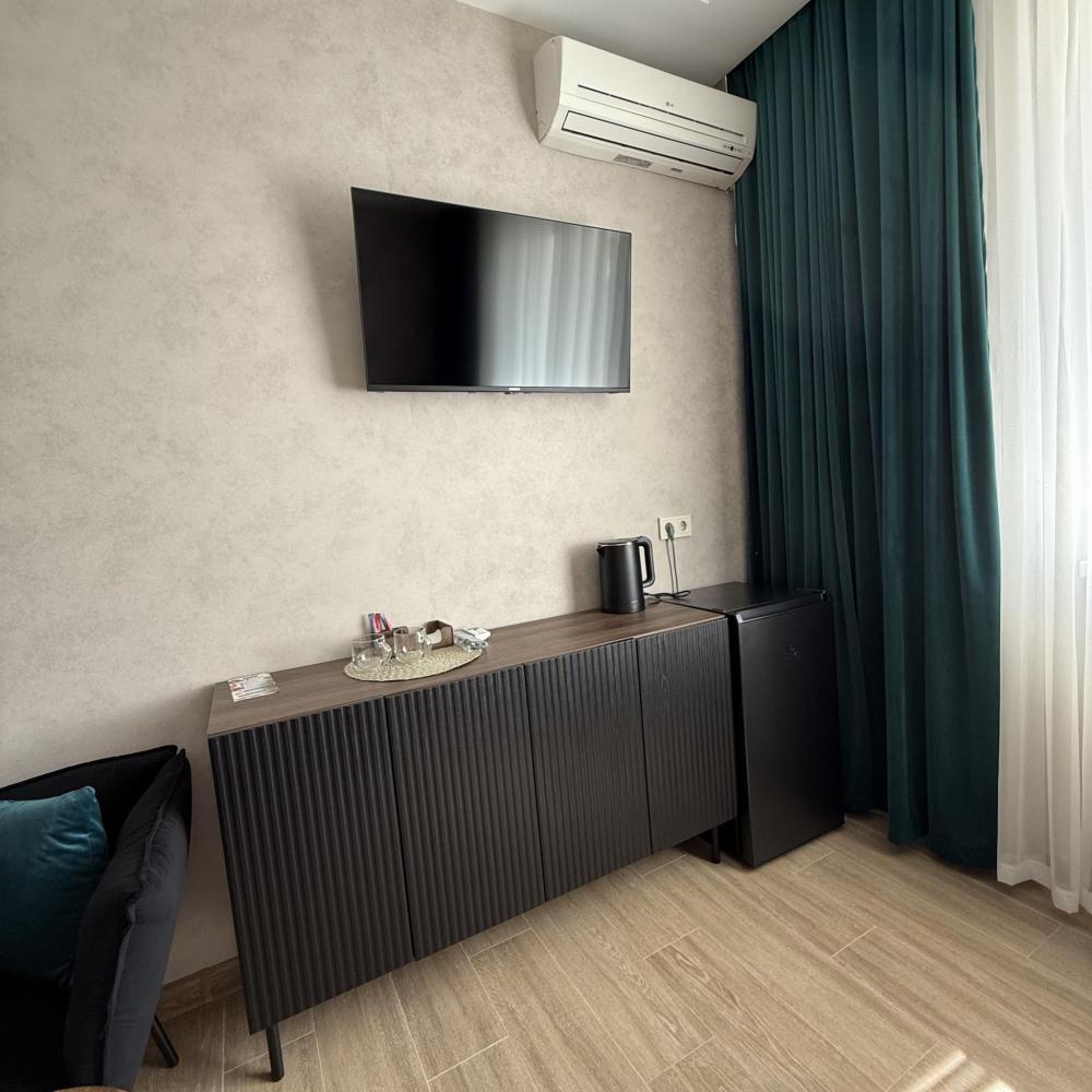 Просторный однокомнатный номер от 20м подходит как для семейного отдыха, так и для одноместного комфортного размещения. Номер оборудован современной мебелью: Двуспальная кровать 1400*2000 с ортопедическим матрасом Прикроватная тумбочка Индивидуальные розетки Обеденный барный стол Два барных стула Журнальный столик Шкаф для одежды Зеркало Телевизор с плоским экраном Сплит-система Электрический чайник, чайные принадлежности Просторный балкон Бесплатный Wi-Fi Отдельный санузел 4м с современной душевой кабиной. Просторная душевая кабина Набор полотенец на 2 персоны Туалет Туалетные принадлежности Современный мощный фен Средства личной гигиены
