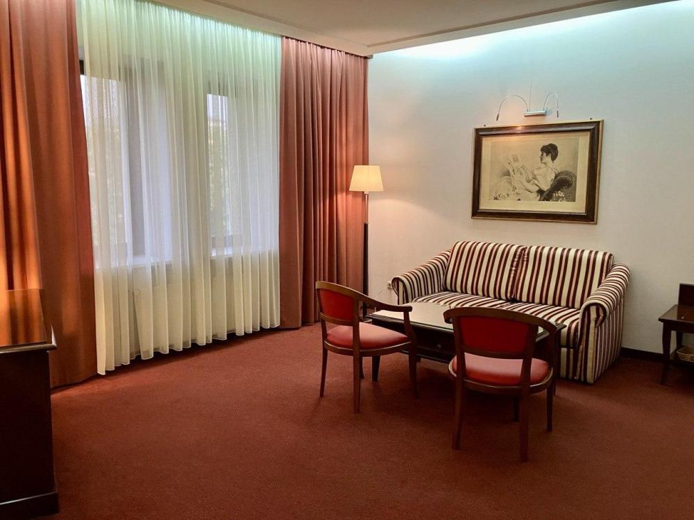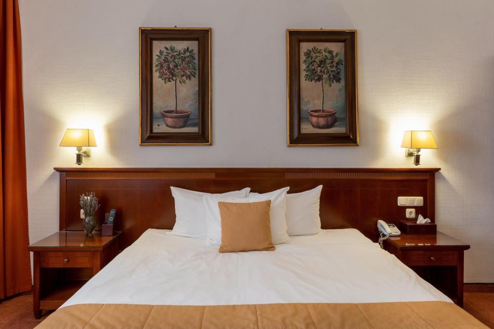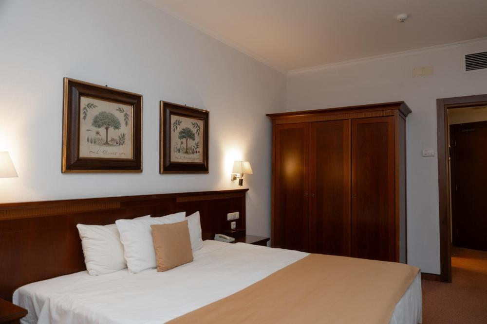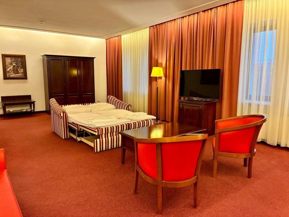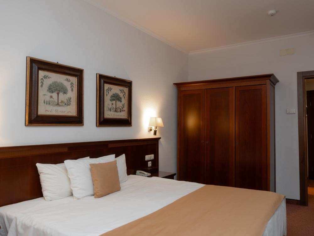 Элегантный просторный номер (площадью 60 м2), сочетающий в себе изящную гостиную и спальню. В гостиной расположены диван (раскладной), журнальный стол, два кресла, рабочий стол. Номера обставлены мебелью ценных пород дерева работы итальянских мастеров фирмы «Selva» (г. Верона). Приватная зона – спальня – скрыта от посторонних глаз в глубине номера. Просторная ванная комната (8 м2) оборудована биде, джакузи, телефоном. Номера имеют повышенную звукоизоляцию и систему климат контроля, которые гарантируют Вам спокойный сон в центре города.