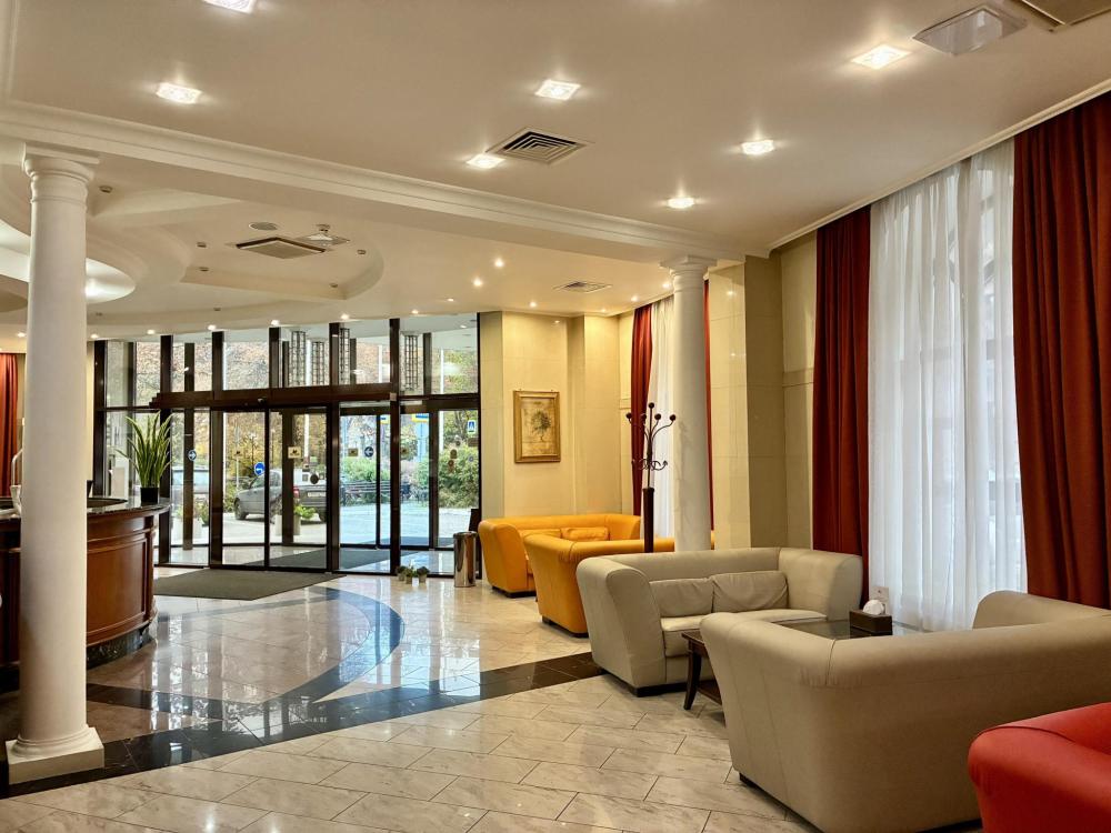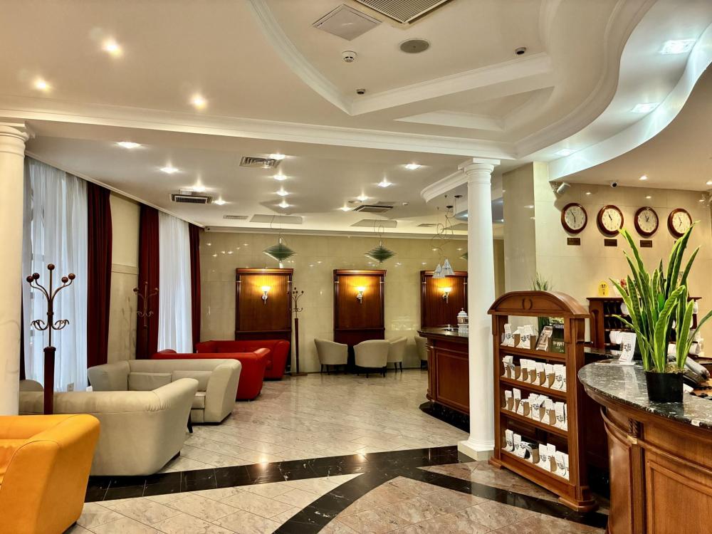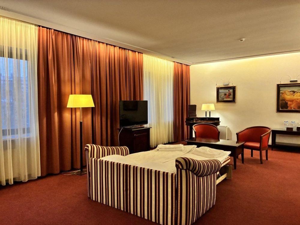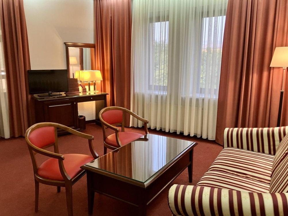Элегантный просторный номер (площадью 60 м2), сочетающий в себе изящную гостиную и спальню. В гостиной расположены диван (раскладной), журнальный стол, два кресла, рабочий стол. Номера обставлены мебелью ценных пород дерева работы итальянских мастеров фирмы «Selva» (г. Верона). Приватная зона – спальня – скрыта от посторонних глаз в глубине номера. Просторная ванная комната (8 м2) оборудована биде, джакузи, телефоном. Номера имеют повышенную звукоизоляцию и систему климат контроля, которые гарантируют Вам спокойный сон в центре города.