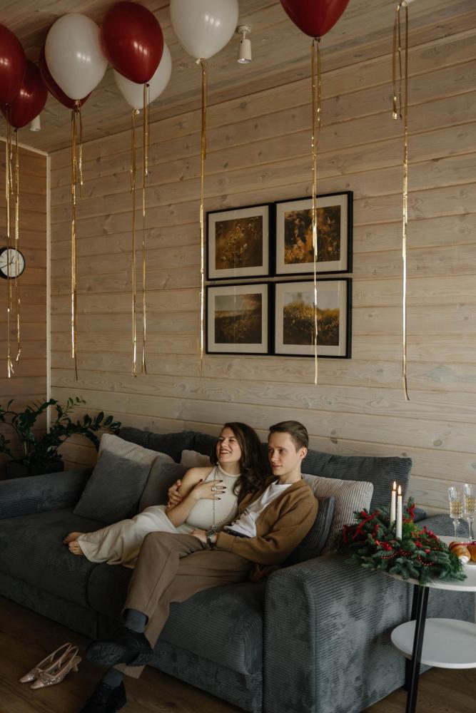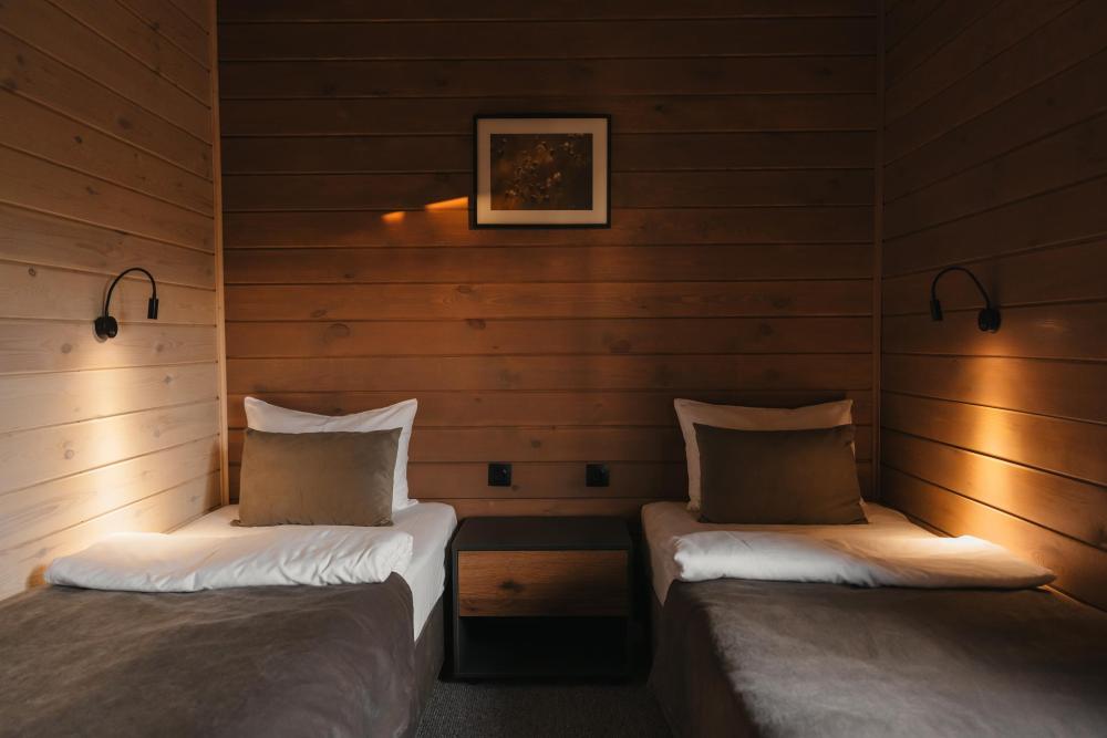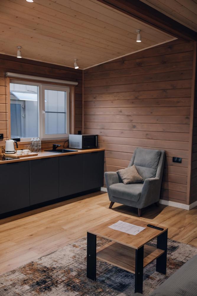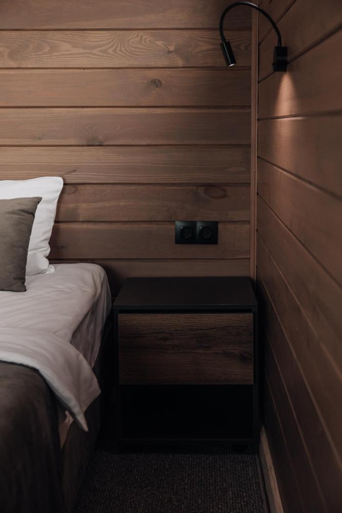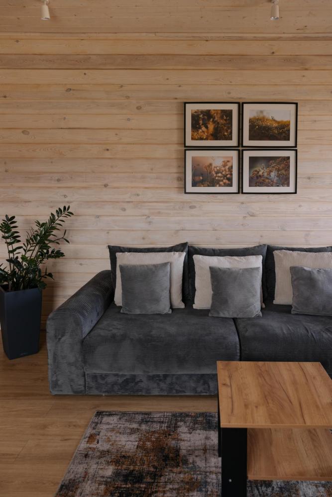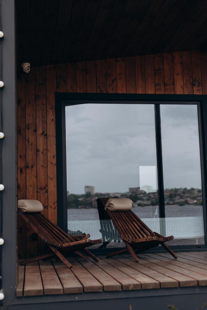 Современный трехкомнатный дом-барнхаус с использованием в интерьере натурального дерева и панорамными окнами с прямым видом на Воронежское море Гостиная с мини-кухней, обеденной зоной, двуспальным раскладным диваном и две спальные комнаты с большими двуспальными кроватями, которые могут быть трансформированы в односпальные. Открытая терраса, собственный зеленый дворик и ванная комната с тропическим душем.