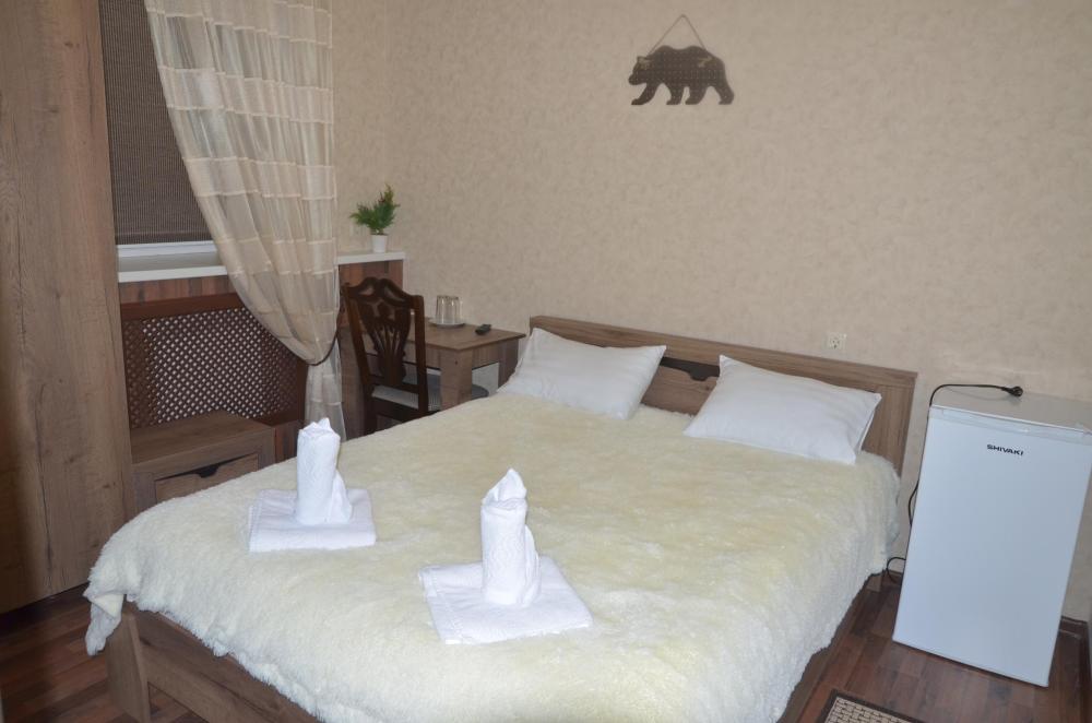 В номере:двуспальная кровать , стулья, письменный стол, шкаф-купе, вешалки для одежды, центральная система кондиционирования, центральное отопление, зеркало, индивидуальные розетки, мягкая гипоаллергенная подушка из «лебяжьего» пуха, натуральное постельное белье из 100% хлопка, посуда, холодильник, интернет, ЖК-телевизор с 20 цифровыми каналами. В санузле на два номера:туалет, раковина, душ-поддон, средства личной гигиены (гель для душа-шампунь, жидкое мыло, туалетная бумага (делюкс)), зеркало, набор из трех полотенец (лицевое, банное, ножное), корзина для мусора. Удобства (фен, чайник, гладильные принадлежности) по требованию, кулер, микроволновая печь на этаже.