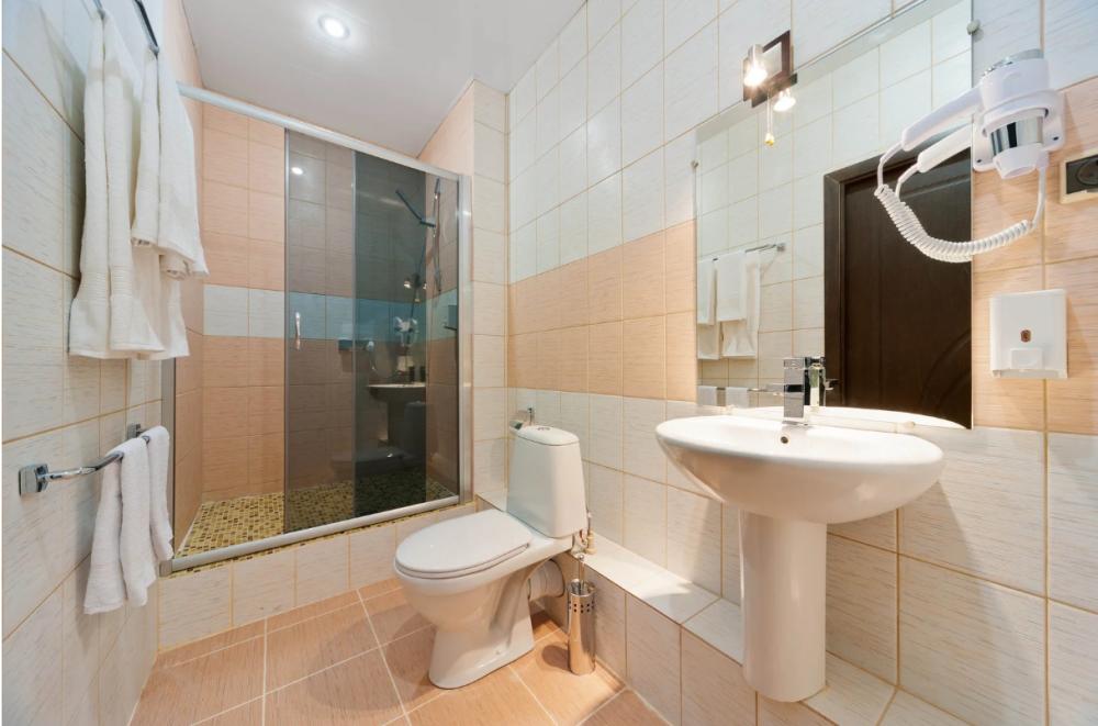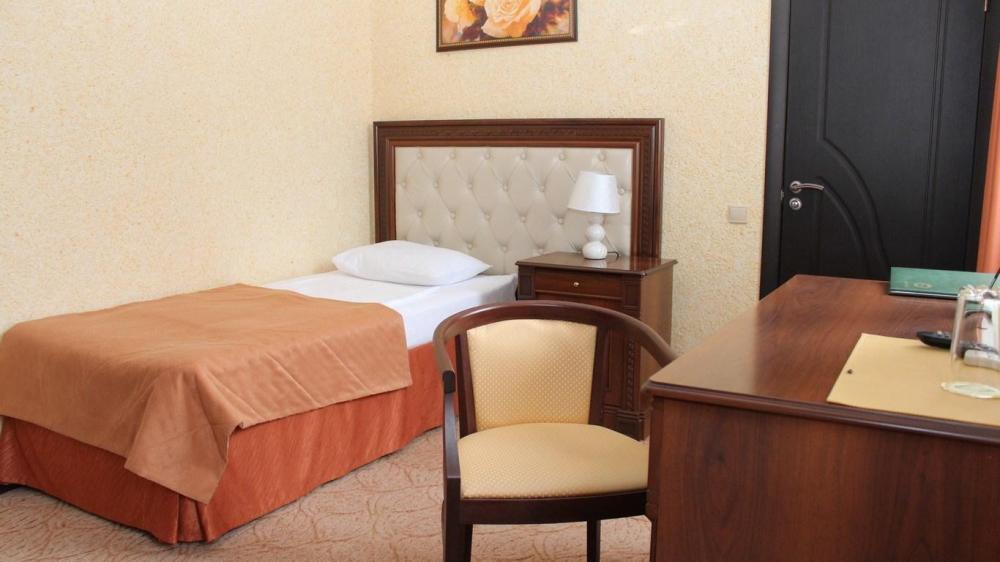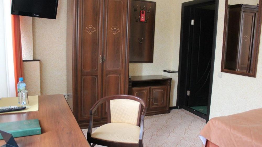 В номере находятся две односпальных кровати, прикроватные тумбы, шкаф для одежды, прихожая, письменный стол, стул, ж/к телевизор, телефон, сейф, холодильник, кондиционер, настольная лампа. В ванной комнате находится душевая кабина, туалет, раковина, фен.