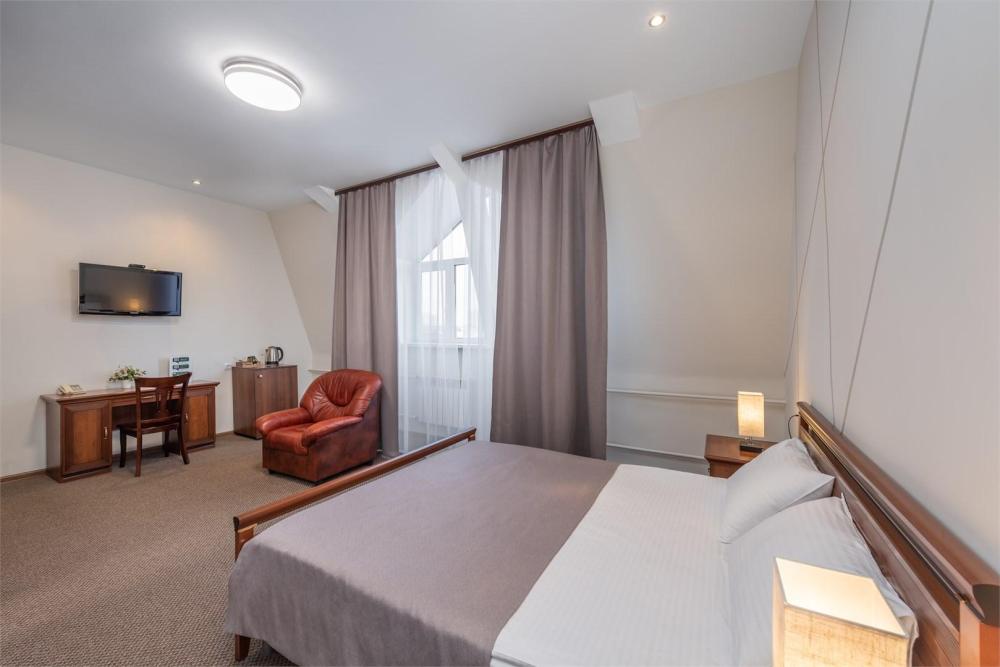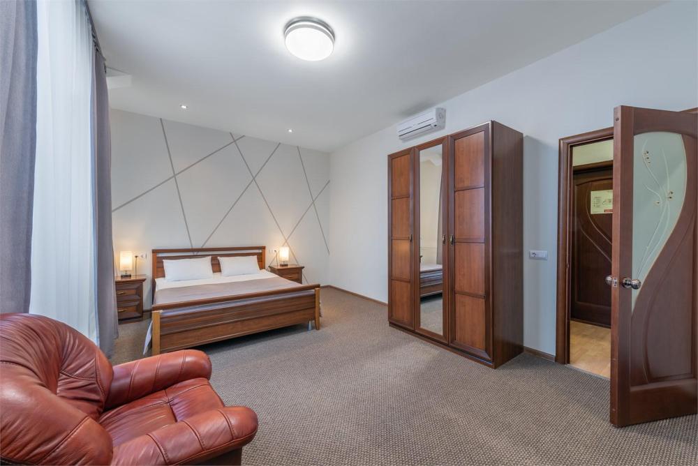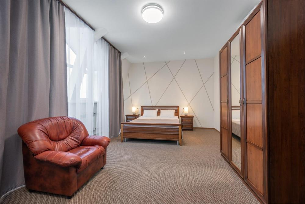 Номер состоит из спальни и гостиной. В спальне находится двуспальная кровать, прикроватные тумбы, шкаф для одежды. В гостиной находится кожаная мебель: диван, кресла, журнальный столик, ж/к телевизор, телефон, сейф, холодильник, кондиционер. В ванной комнате находится душевая кабина, туалет, раковина.