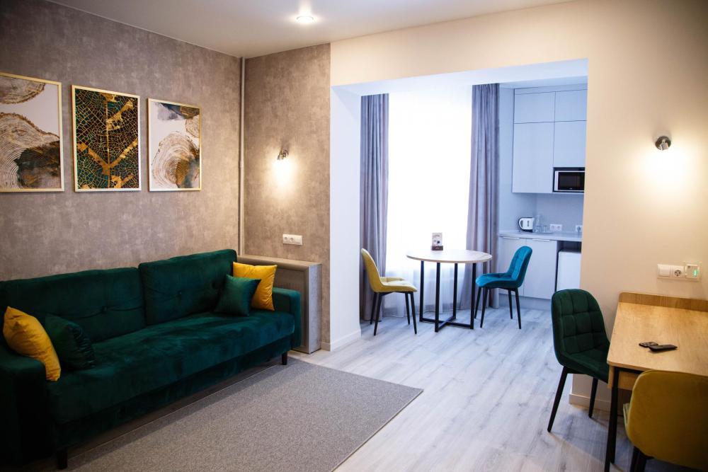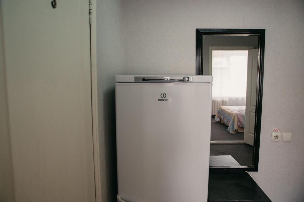 Одна жилая комната с кондиционером, холодильником, Wi-Fi на 1-м этаже с окнами на северо-запад. Зональное разделение на рабочую зону и зону отдыха, полный санузел в номере, интерьер в классических тонах, ковролин. В номере: одна двуспальная кровать (140*200), шкаф встроенный с вешалкой, кондиционер, столик чайно-кофейный, торшер, мини-бар, телевизор ЖК, журнальный столик, мягкий диван (раскладной), прихожая с зеркалом, багажница. Санузел: душевая кабина 85*120, унитаз-компакт, умывальник, зеркало, фен, средства индивидуального пользования, полотенца махровые.