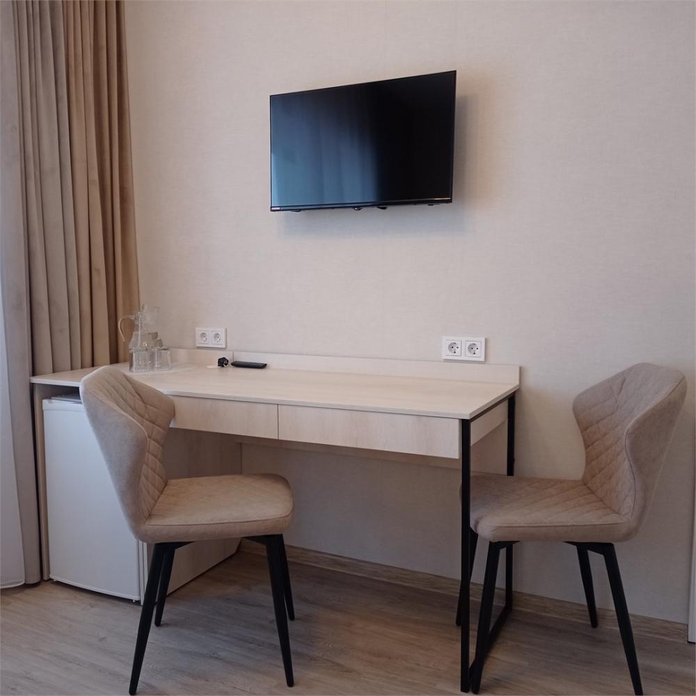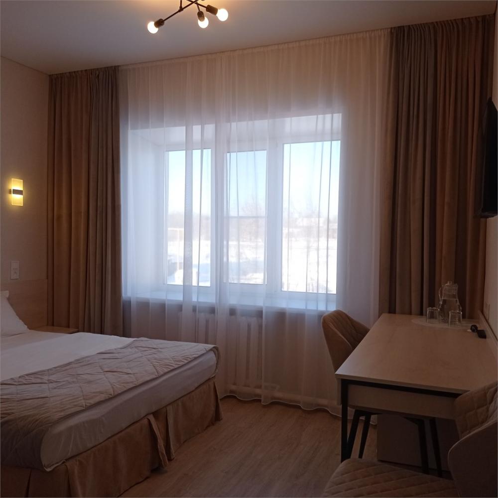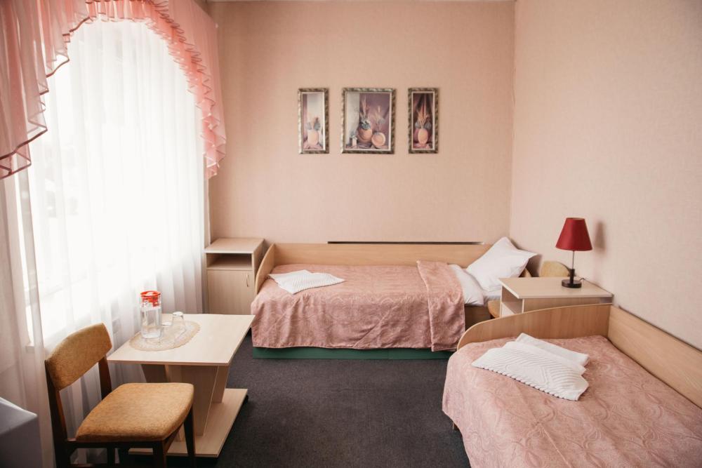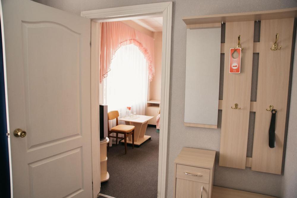 Одна жилая комната с Wi-FI. кондиционером на втором этаже с окнами на северо-запад; Прихожая, полный санузел, интерьер в классических бежевых тонах, ковролин. В номере: Две односпальные кровати (80*200) или одна двуспальная (160*200) с прикроватной тумбой, стол рабочий, мини-бар, телевизор, Столик чайно-кофейный с креслами, шкаф-купе с зеркалом, кондиционер. Санузел: душевой угол, унитаз-компакт, умывальник, фен, средства индивидуального пользования, полотенца махровые.
