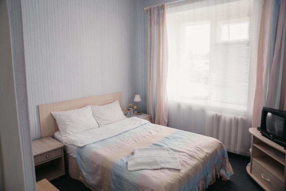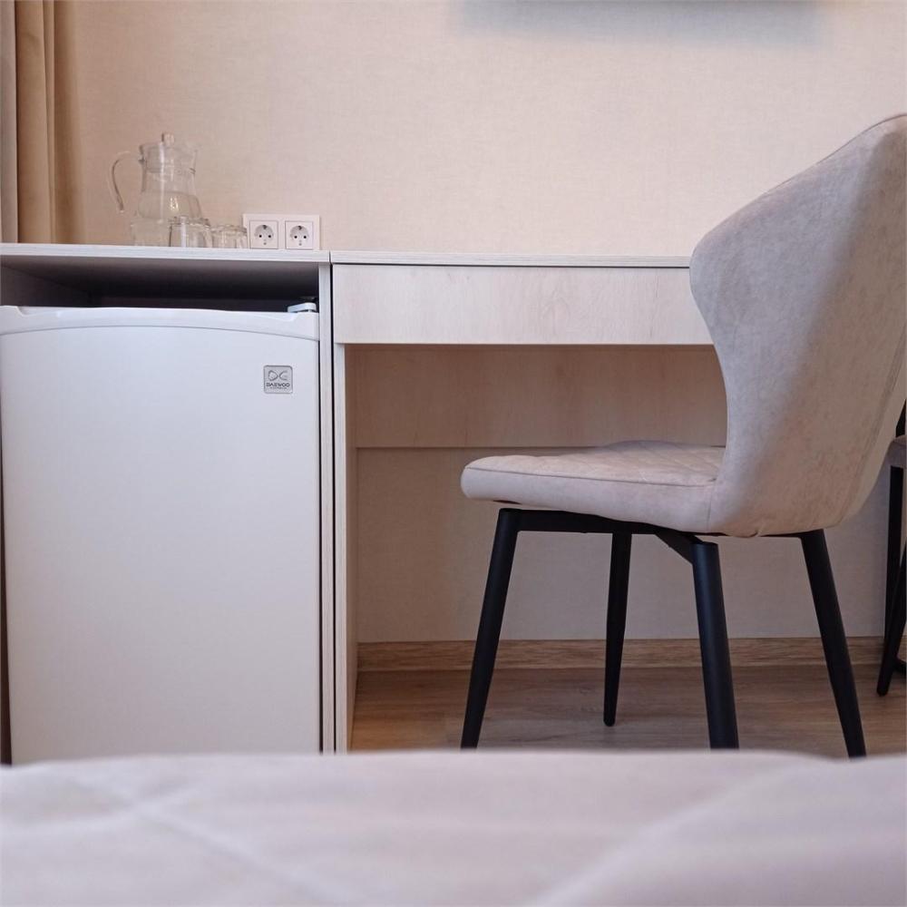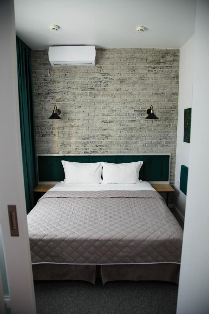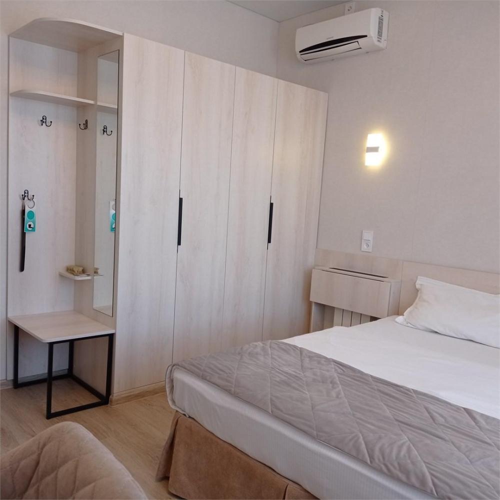Одна жилая комната с Wi-FI. кондиционером на втором этаже с окнами на северо-запад; Прихожая, полный санузел, интерьер в классических бежевых тонах, ковролин. В номере: Две односпальные кровати (80*200) или одна двуспальная (160*200) с прикроватной тумбой, стол рабочий, мини-бар, телевизор, Столик чайно-кофейный с креслами, шкаф-купе с зеркалом, кондиционер. Санузел: душевой угол, унитаз-компакт, умывальник, фен, средства индивидуального пользования, полотенца махровые.