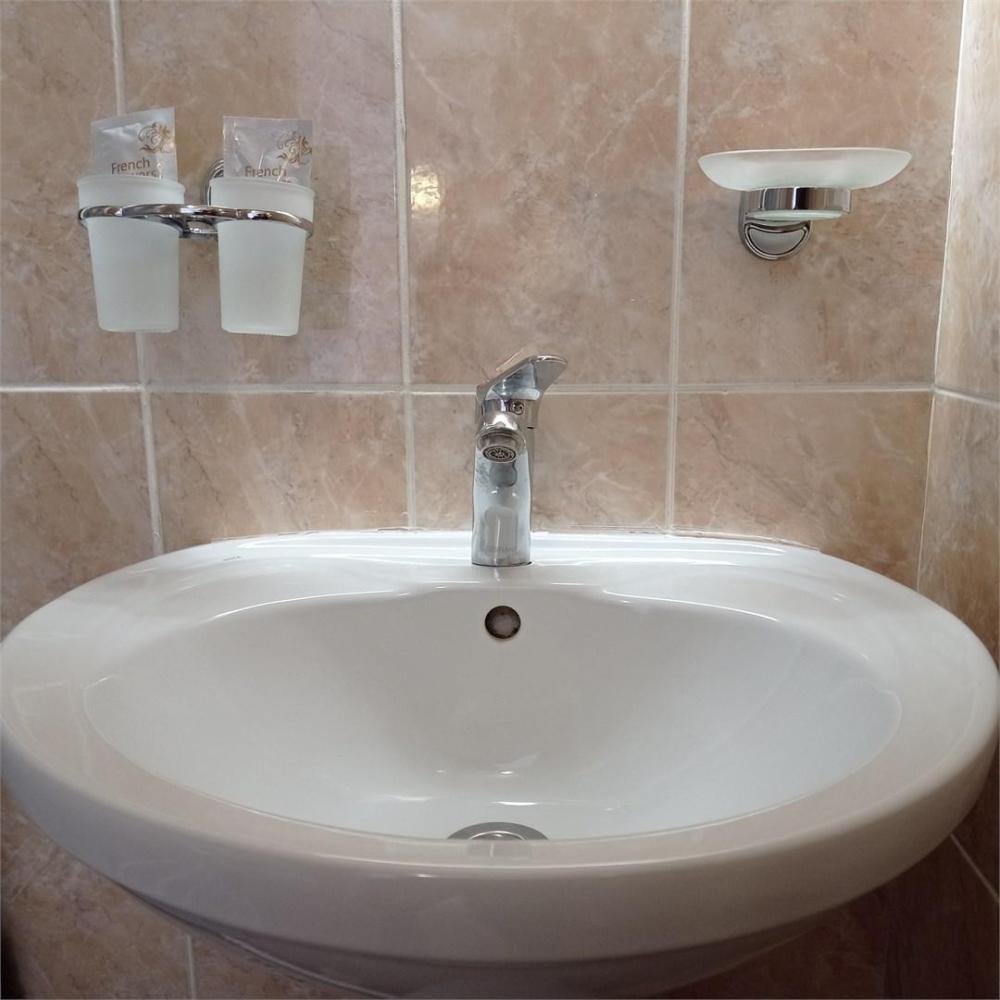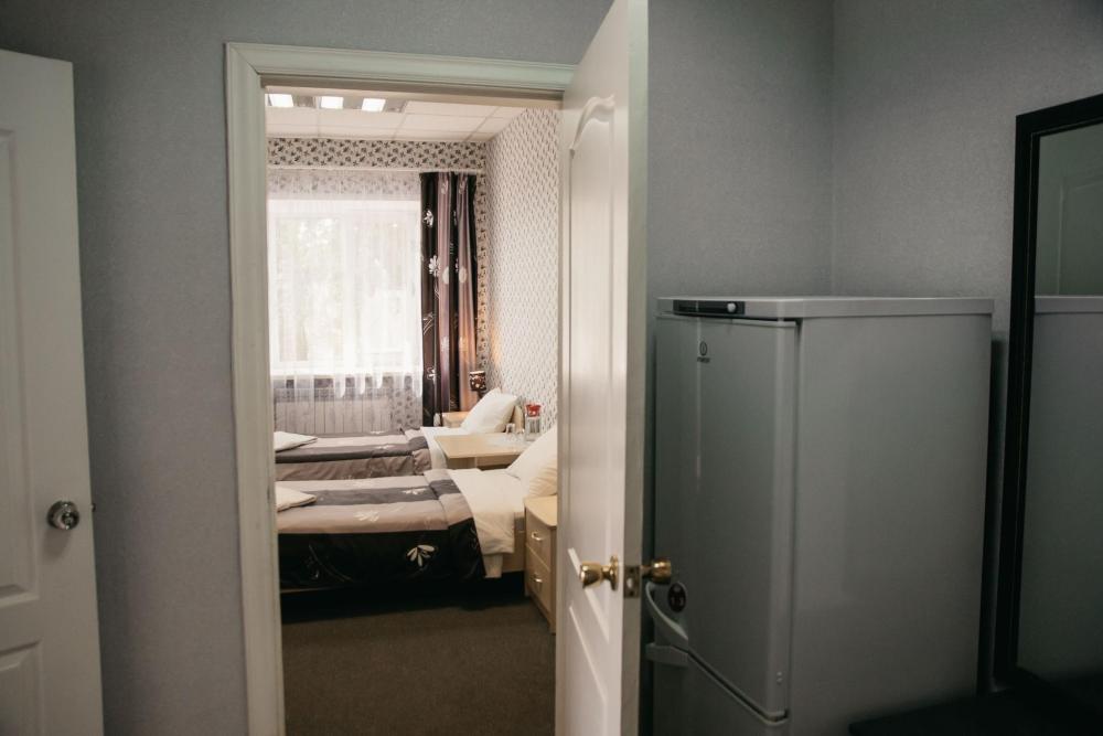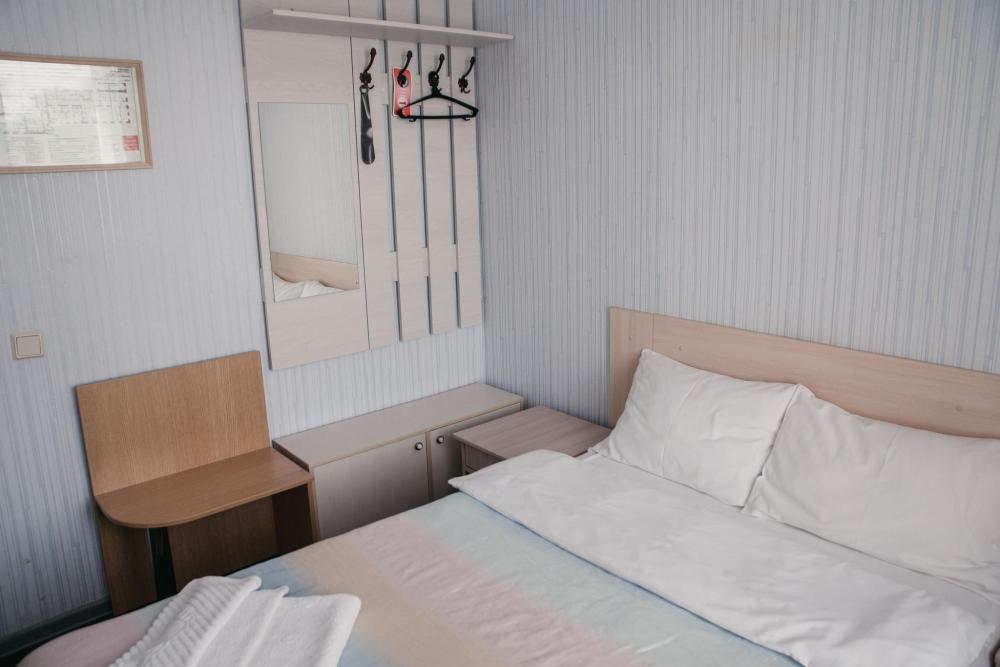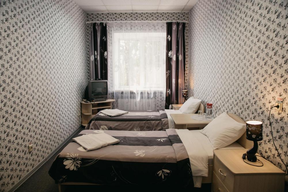 Одна жилая комната с прихожей, кондиционером, холодильником, WI-FI на первом этаже с окном на северо-запад; В номере: 2 односпальные (80*200) кровати; журнальный столик; телевизор; холодильник; шкаф угловой с пеналом и этажеркой; прихожая-вешалка с тумбой. Санузел: душевой угол, унитаз-компакт, умывальник с пьедесталом, зеркало со шкафчиком, фен, средства индивидуального пользования, полотенца махровые.