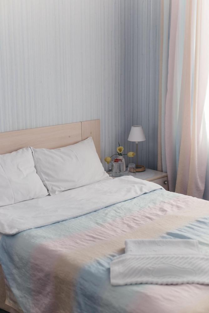 2-х местная комната с двумя 1-но спальными кроватями. Все кровати оснащены ортопедическими матрасами, в каждой комнате есть телевизор с волновыми цифровыми каналами, журнальный столик, стулья. Каждому гостю предоставляется комплект махровых полотенец. В коридорчике один общий холодильник и санузел с ванной на три комнаты.