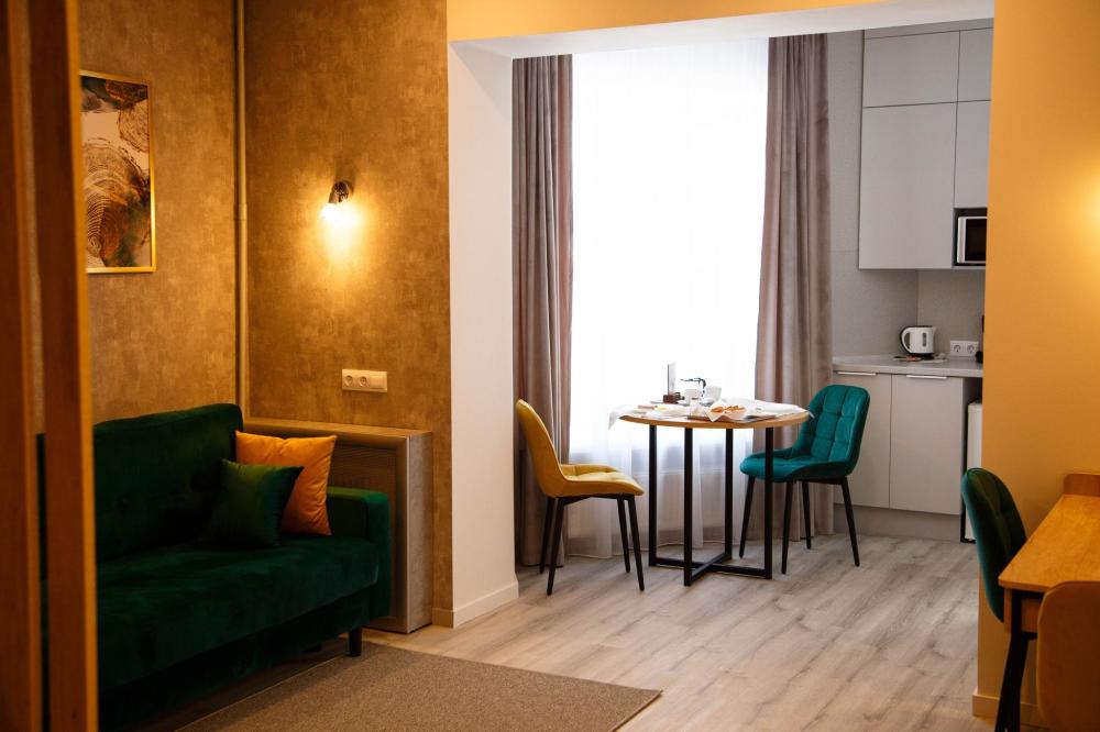 Комфортный 2-х комнатный номер с камином, кухонной зоной и большим санузлом в номере. Удобное расположение на 1 этаже отеля. Отлично подойдет как для бизнес командированных , семей с детьми, а также для романтического вечера на двоих. Максимальная вместимость 4 человека. Одна двуспальная кровать, двуспальный диван- кровать, рабочая зона с Wi-FI. ТВ, холодильник, СВЧ, приветственный чайный набор с чайником, набор столовой посуды, кондиционер, комплект полотенец, фен, средства индивидуального пользования, тапочки и махровый халат.
