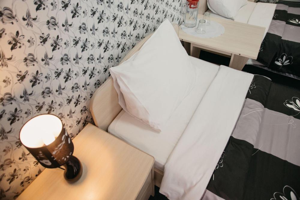 2(3)-х местная комната с двумя 1-но спальными кроватями. Есть возможность установить доп. кровать (при необходимости) Все кровати оснащены ортопедическими матрасами, в каждой комнате есть телевизор с волновыми цифровыми каналами, журнальный столик, стулья. Каждому гостю предоставляется комплект махровых полотенец. В коридорчике один общий холодильник и санузел с ванной на три комнаты.
