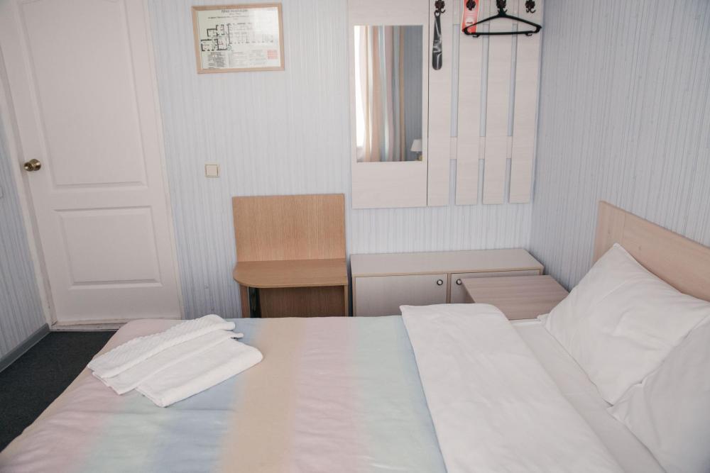 Одна жилая комната с кондиционером, холодильником, WI-FI с полным санузлом на первом этаже с окнами на северо-запад. Интерьер в светлых тонах, ковролин. В номере: 2 односпальные кровати (80*200) или 1 двуспальная кроввать, с прикроватной тумбой, туалетный столик с зеркалом, кондиционер, стол рабочий, холодильник, телевизор ЖК, журнальный столик, шкаф двустворчатый. Санузел: душевой угол, унитаз-компакт, умывальник, зеркало, фен, средства индивидуального пользования, полотенца махровые.