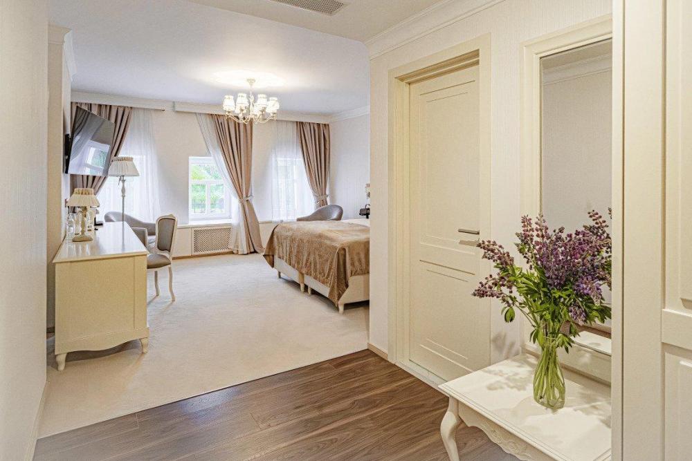 Просторный номер повышенной комфортности для двоих с двумя раздельными кроватями или с одной двуспальной кроватью. С возможностью размещения третьего человека на дополнительном месте .Оборудован необходимой мебелью (стол, шкаф, тумбочка), спутниковым телевидением, телефоном. В сан.узле душевая кабина и ванные принадлежности. Номер расположен в главном музейном корпусе.