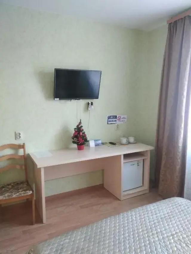 В номере: двуспальная кровать, стол, стулья, шкаф, тумбочка, телевизор, Wi-Fi, электрочайник, холодильник.
