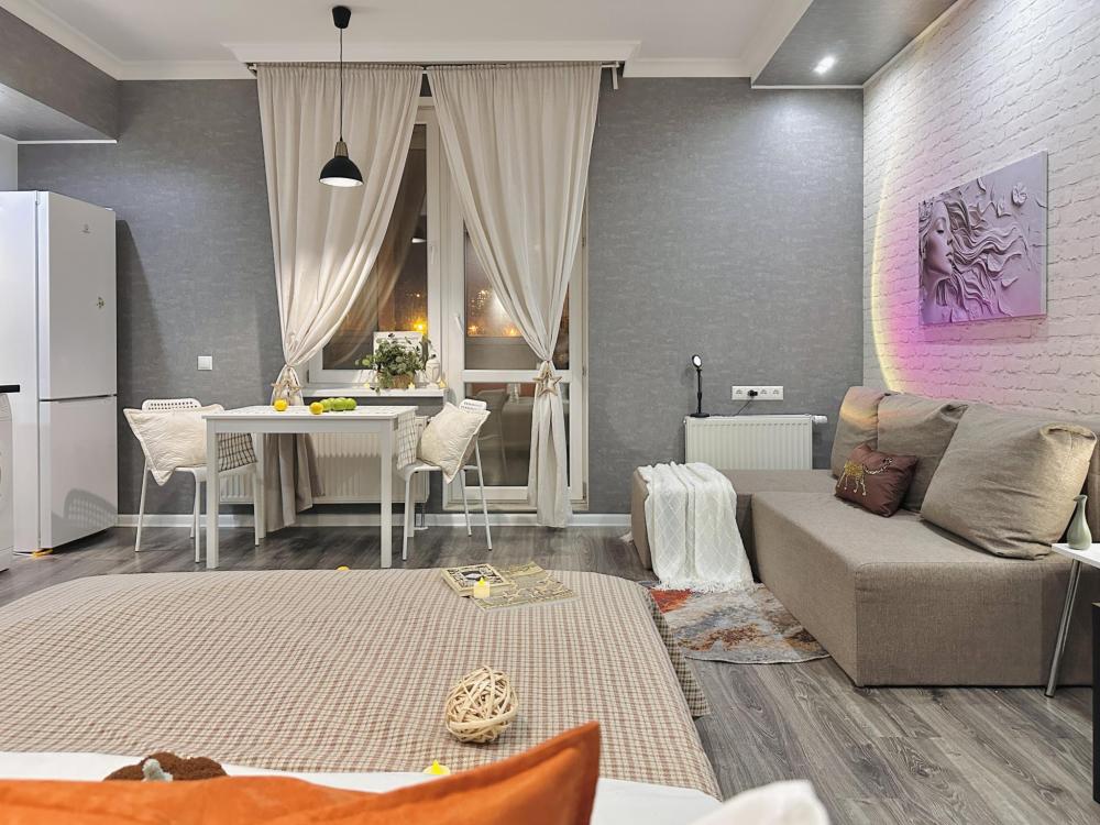 Студия с панорамным видом. В комнате с панорамным видом удобно расположился большой двуспальный диван, который на день можно собрать и, тем самым, увеличить свободное пространство. Полноценная кухня с обеденным столом на двоих. Большая ванная комната с душевой кабиной....