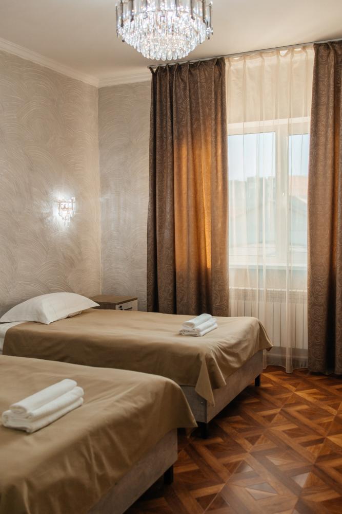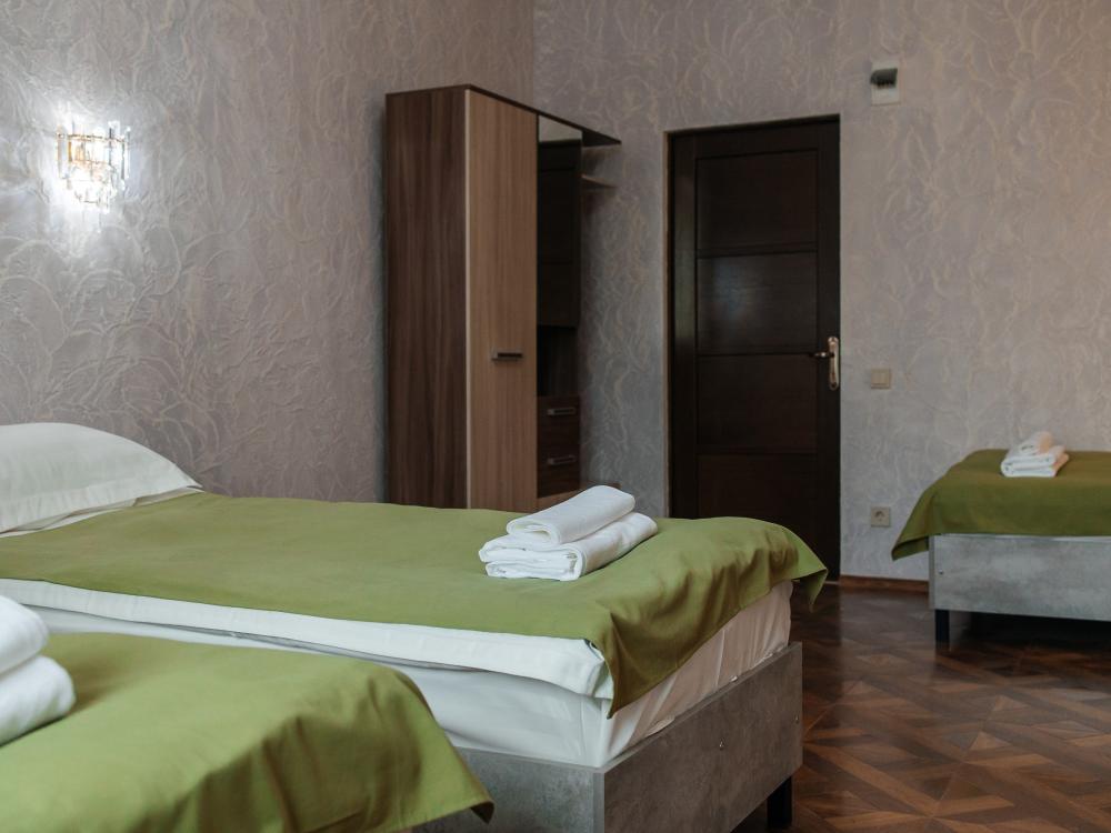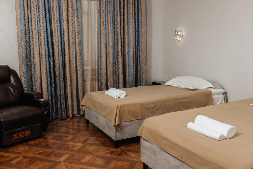 Трехместный номер люкс общей площадью 35 кв.м. В номере: 3 односпальные кровати 90х200см, 3 прикроватные тумбы, стол, стул, TV, Wi-Fi, ванная комната с душем.