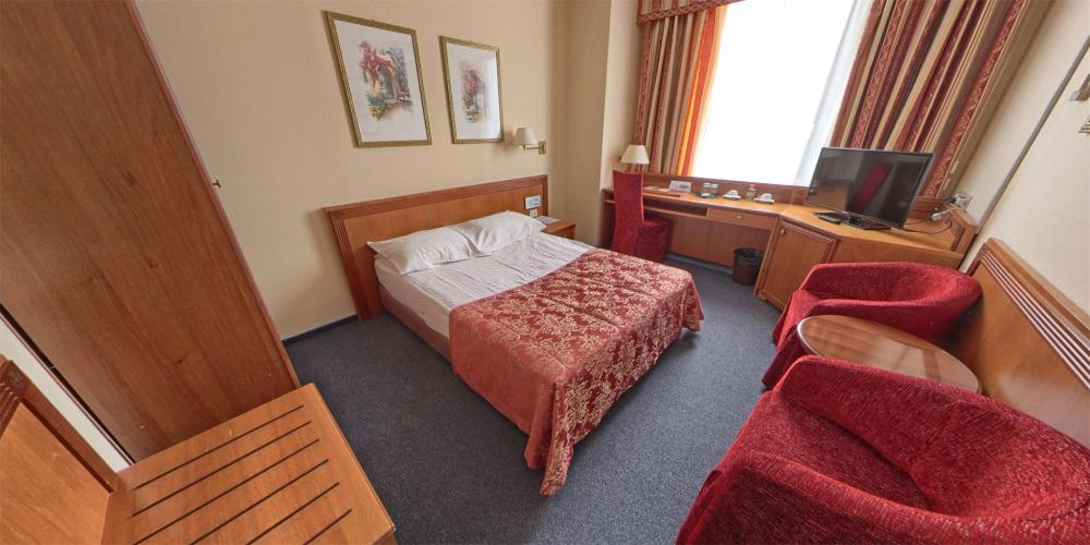 Одноместный однокомнатный номер стандарт (спальня, прихожая, ванная комната) В номере: 1,5-спальная кровать, мягкая мебель, просторный гардероб, универсальный стол, телефон с междугородним и международным выходом, кондиционер, кабельное телевидение, мини-бар, фен, ванная комната.