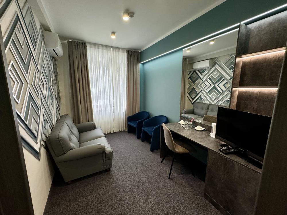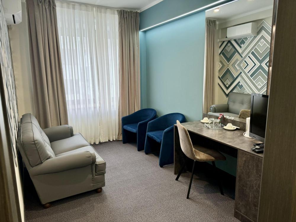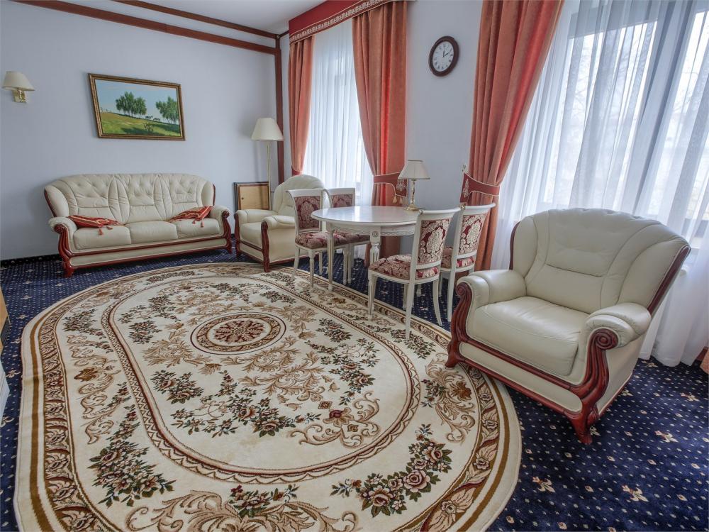 Двухкомнатный номер люкс (гостиная, спальня, ванная комната) В номере: двуспальная кровать или две односпальные кровати, мягкая мебель, просторный гардероб, универсальный стол, телефон с междугородним и международным выходом, кондиционер, кабельное телевидение, мини-бар, фен, ванная комната.