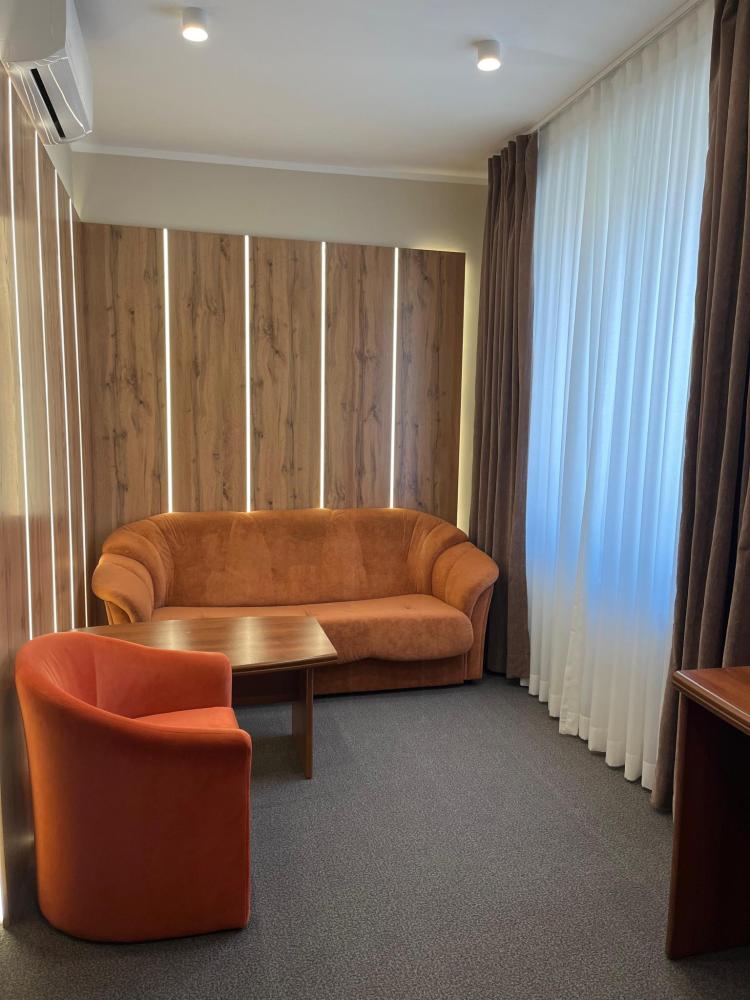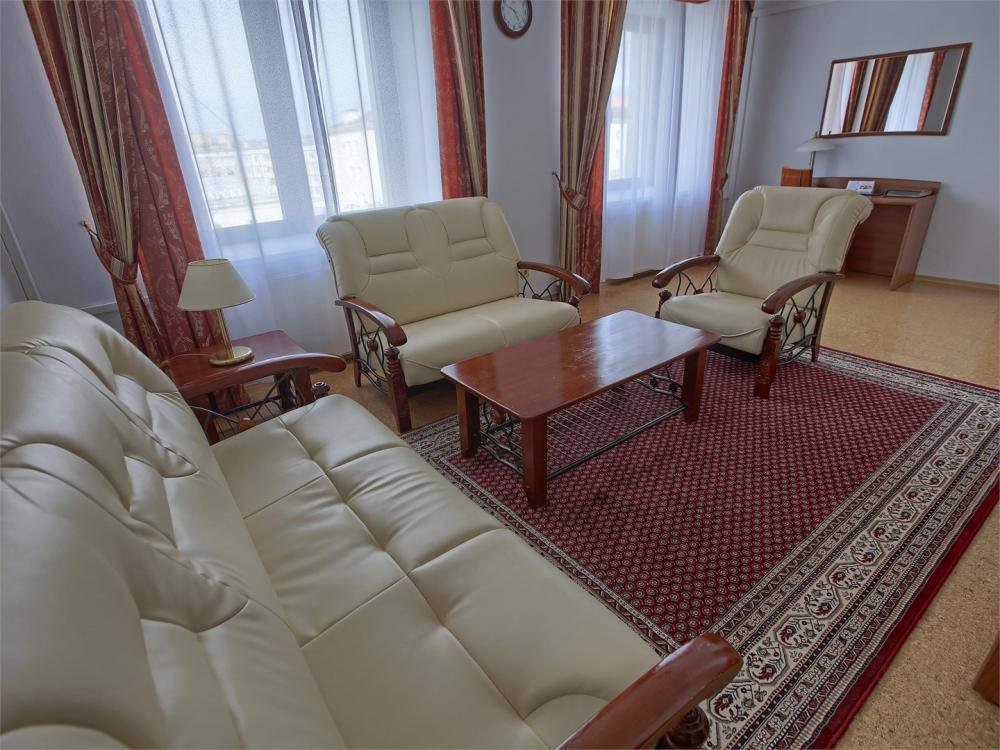 Двухкомнатный номер люкс улучшенный (гостиная, спальня, ванная комната) В номере: двуспальная кровать или две односпальные кровати, мягкая мебель, просторный гардероб, универсальный стол, телефон с междугородним и международным выходом, кабельное телевидение, холодильник, мини-бар, фен, кондиционер, ванная комната.