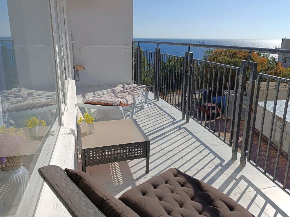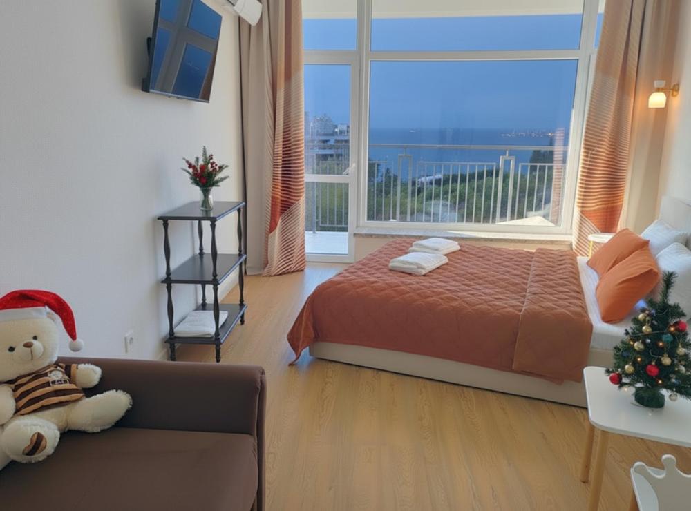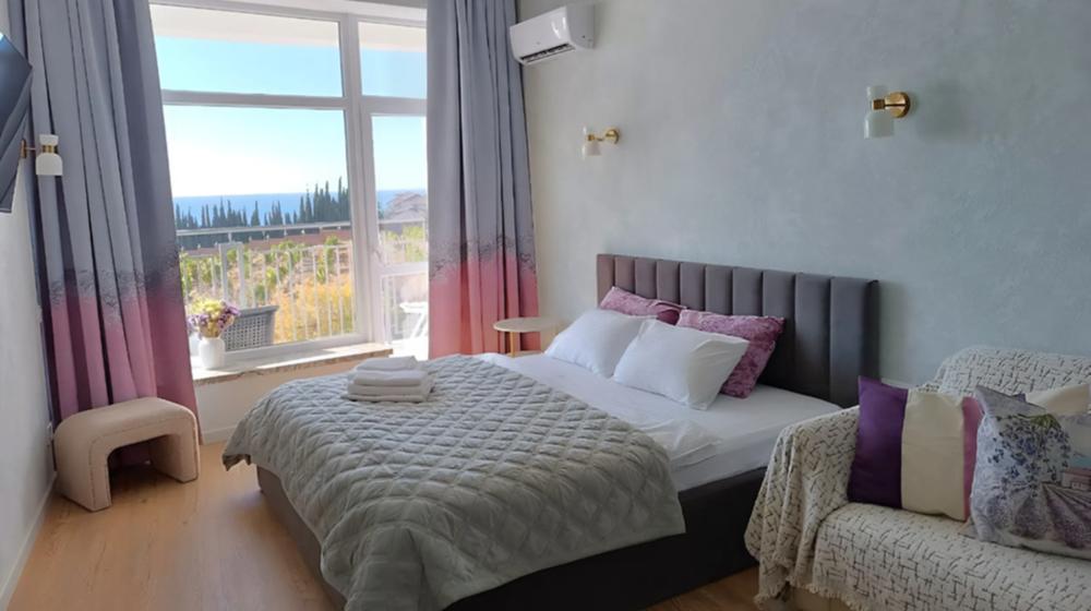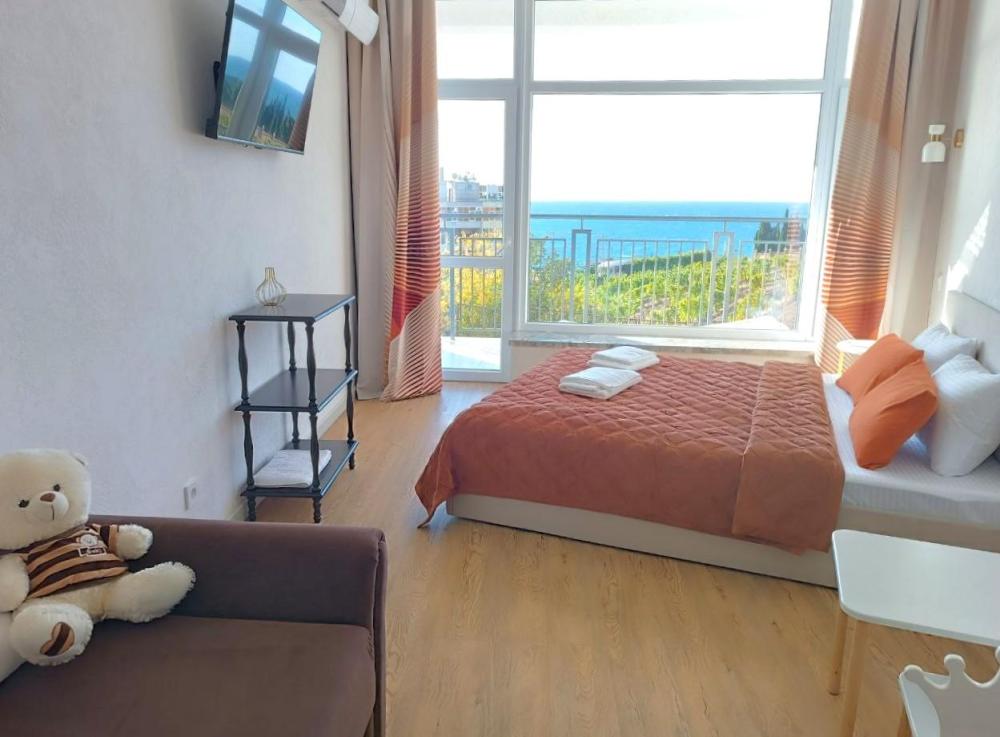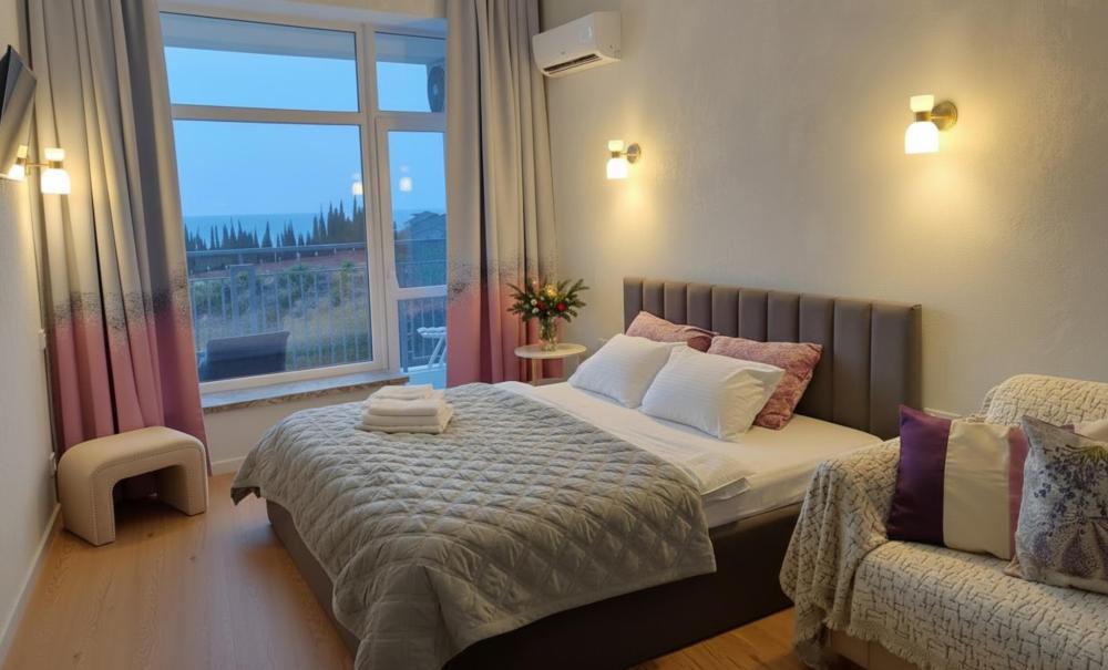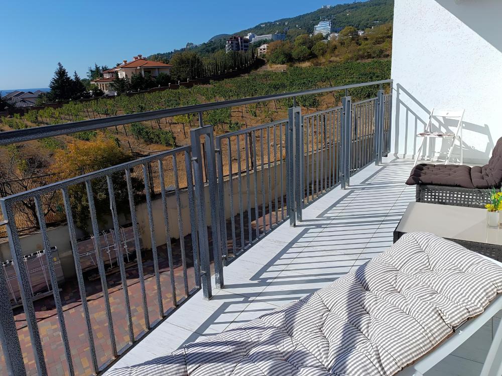 В квартире две просторные изолированные комнаты, стильная обеденная зона, оснащенная кофемашиной, микроволновкой и всем необходимым, комфортная лоджия с мебелью и видами на море и виноградники.