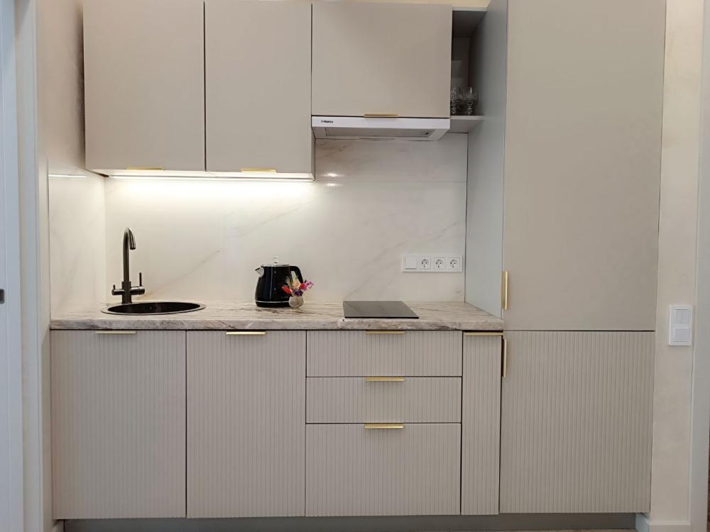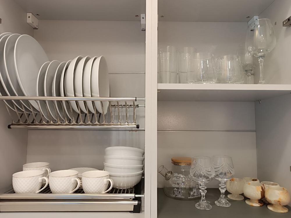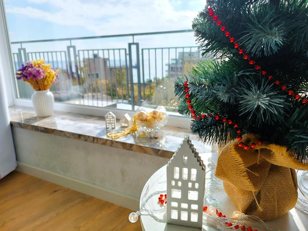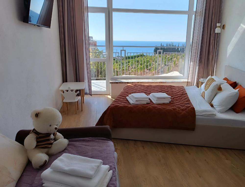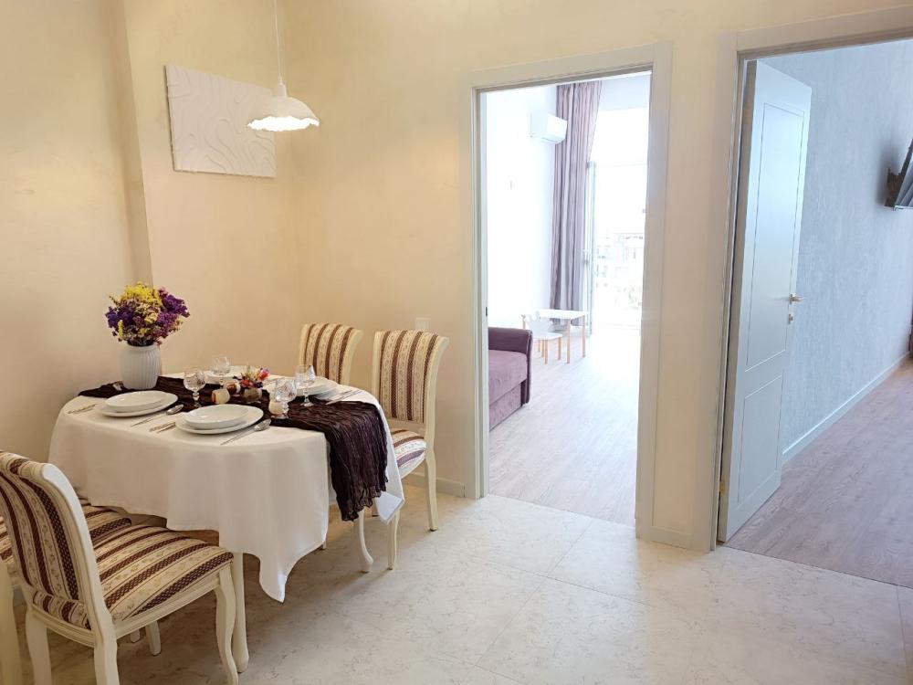 В квартире две просторные изолированные комнаты, стильная обеденная зона, оснащенная кофемашиной, микроволновкой и всем необходимым, комфортная лоджия с мебелью и видами на море и виноградники.
